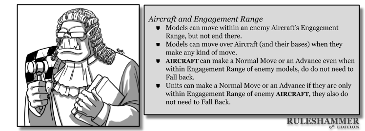 Although Aircraft models have an Engagement Range (pg 4) like any other model, the following rules and exceptions apply to it – this will account for the fact that typically Aircraft models are soaring overhead and not skimming along the ground.