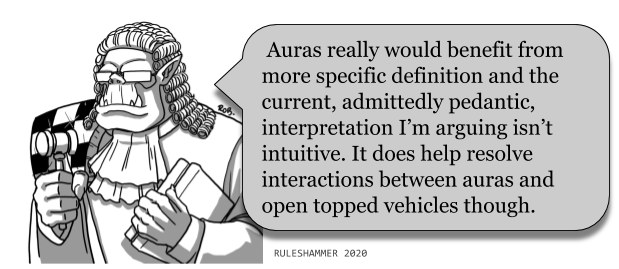 LINK Last week I discussed Open-Topped vehicles and how those rules can differ from codex to codex. I want to elaborate a little on how auras apply though and this is where the aura or not an aura distinction really comes in. First of all let's pick an example of an Open-Topped rule again: