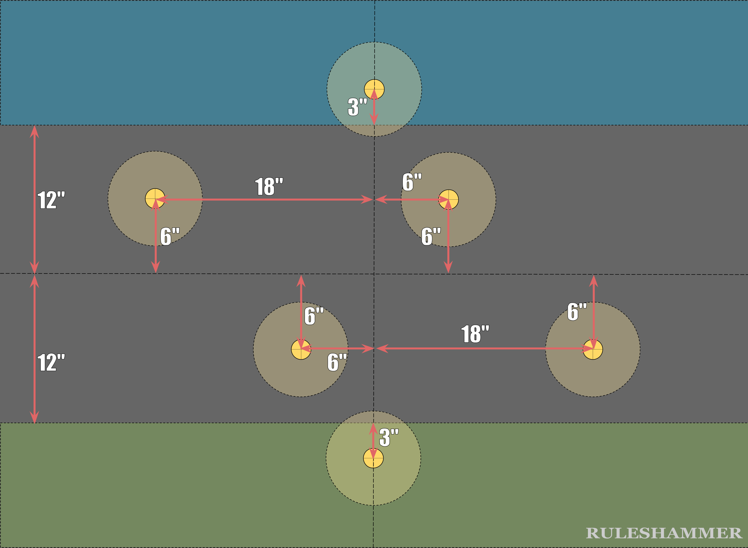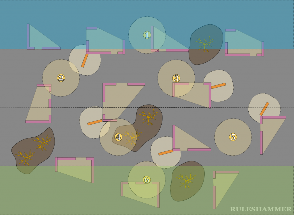 The first thing to note from the mission map is where the Objectives will be placed. The mission packs tend to presume you will be placing objectives on an empty board with terrain being placed after them; bear that in mind when we get to the board layout later on.
