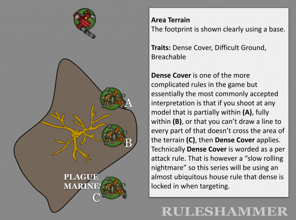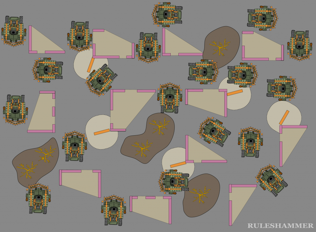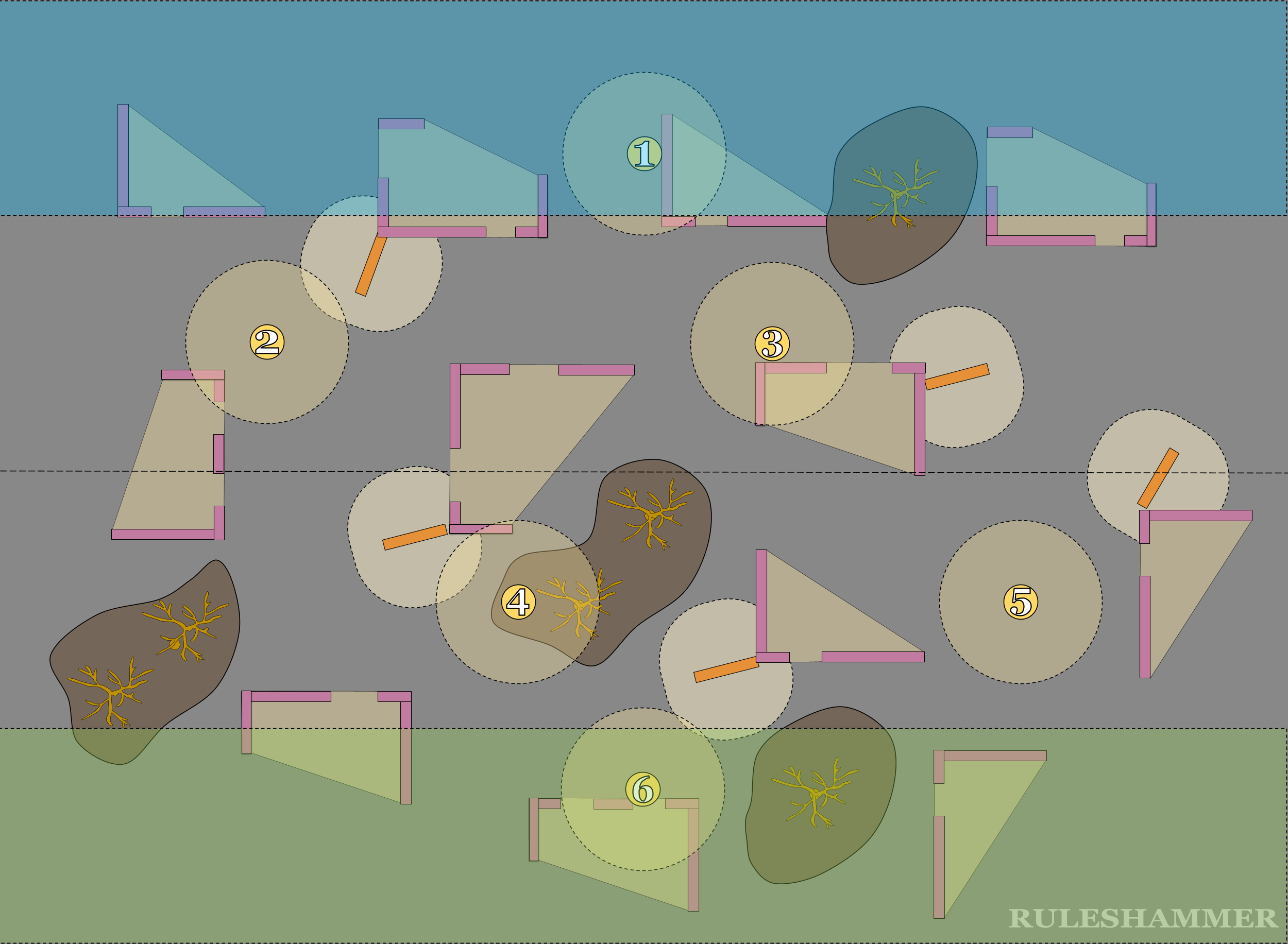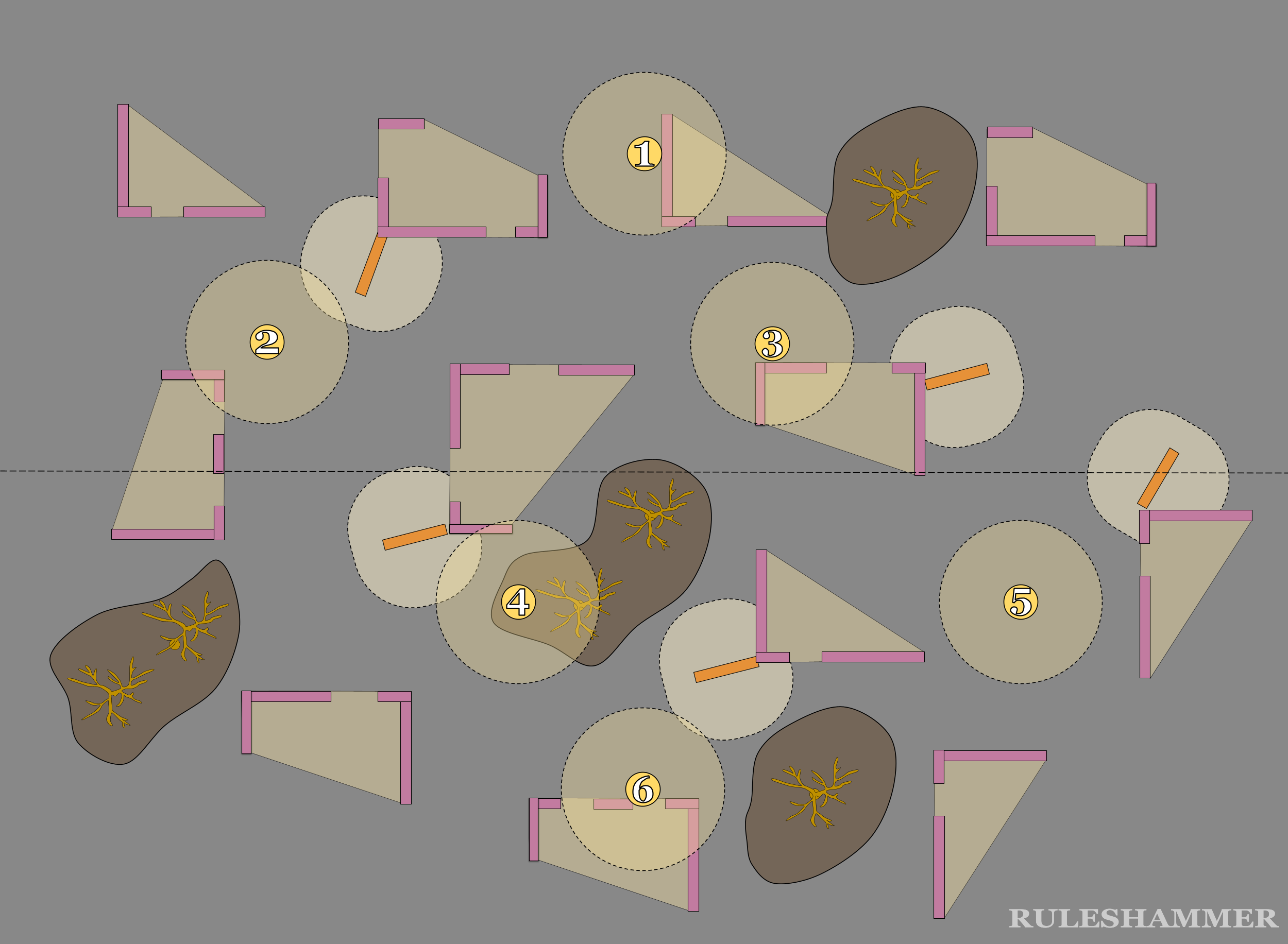 This is the name I'm giving to a house rule you will see in use in almost every game of Warhammer 40k in 9th edition, especially if you do go on to play at events. Simply put the trees modelled on a piece of Dense Terrain such as the forests I'm using in this series are usually removable and are often played as not being a barrier to movement even by larger models. The terrain still has the Difficult Ground terrain trait so these area terrain pieces are a hindrance to movement but including a reasonable amount of Dense Terrain without using this house rule (as Dense terrain must be more than 3" in height to have an effect rules as written) is very difficult. A variant of this you might also encounter are "smoke stack" terrain pieces. Large vent grills that are to be treated as more than 3" tall and provide the same Dense Cover traits as these forests, but with no trees to ignore and in their place the player is meant to imagine a large exhaust cloud. With that in mind we can now verify that our layout does sufficiently allow a large model to move around.