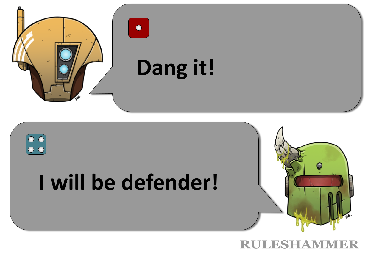 First we determine attack and defender with a dice roll. In Matched player missions these titles very rarely mean much at all, there a few missions where attackers do a thing and the defender but they are almost always only during game setup. The main thing this check decides in every mission is who choose deployment zones. Which leads us to our very first dice roll of the game (other than the mission roll). Both Players roll off and the winner decides which player is which.
