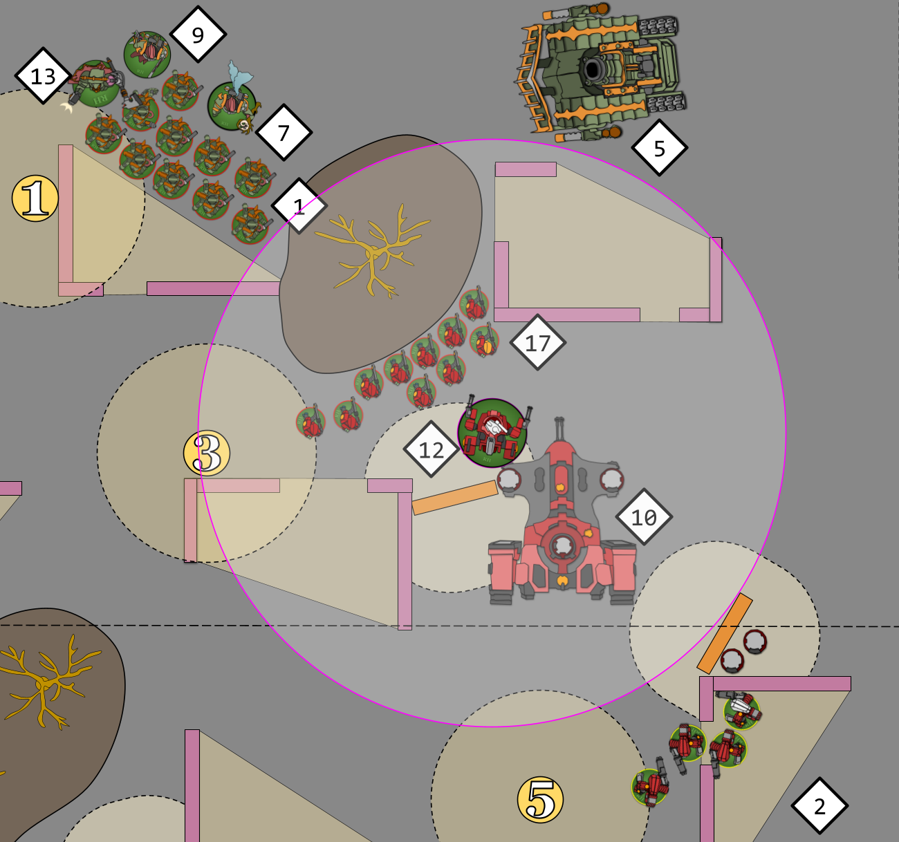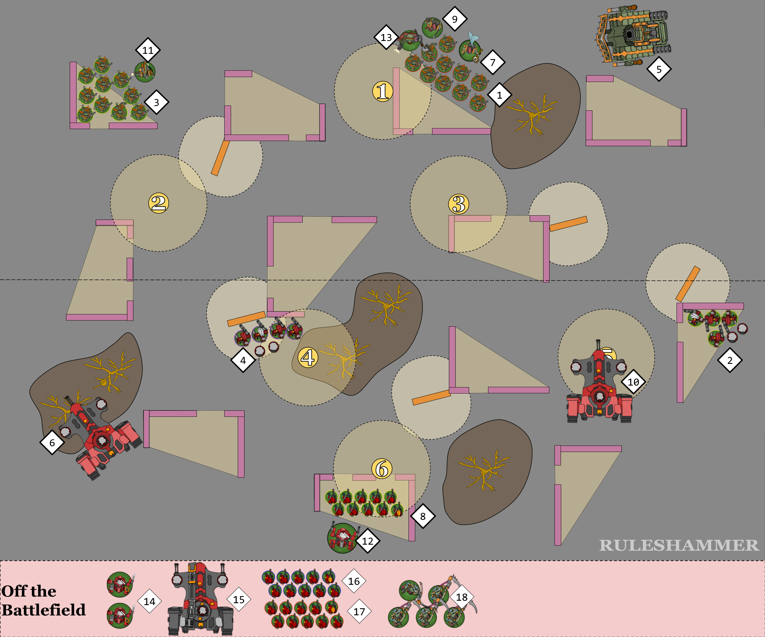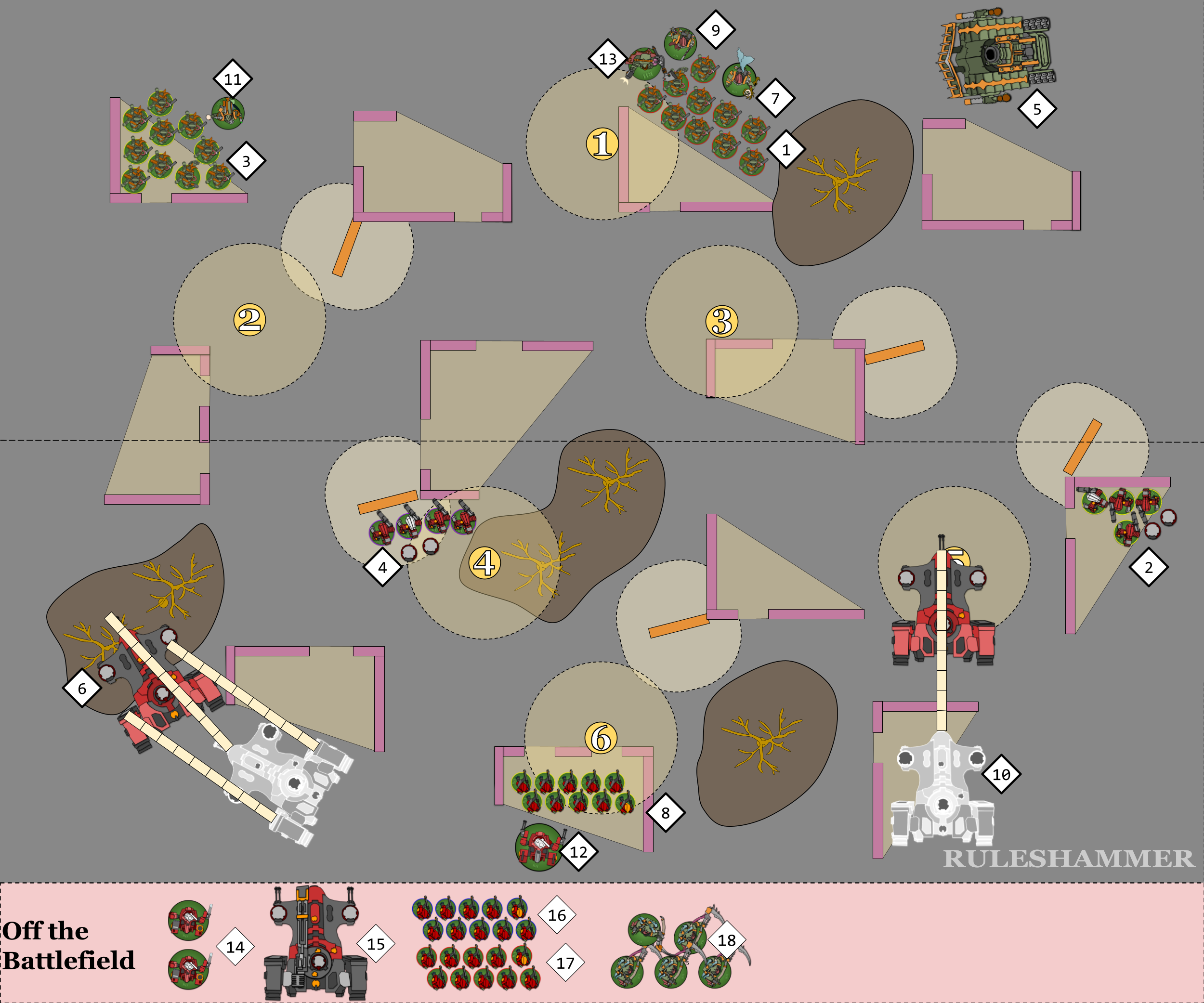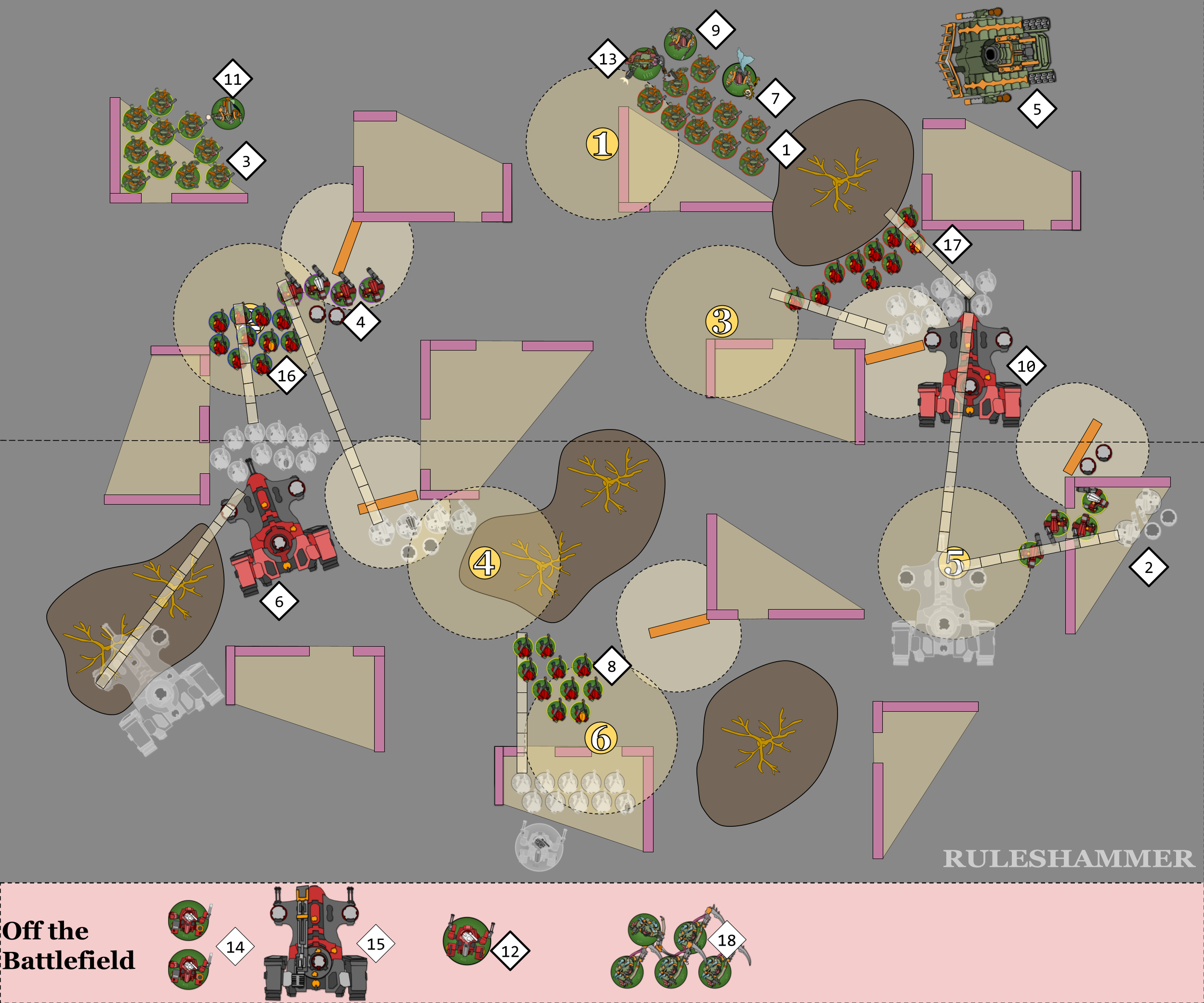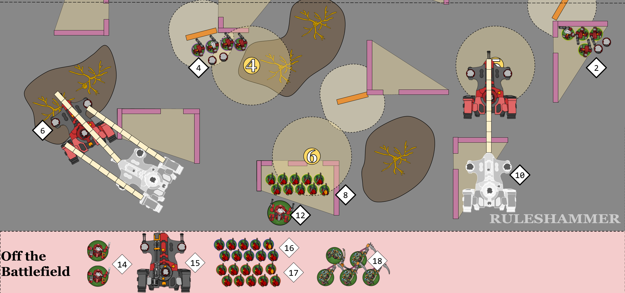 - The Breacher Units (16) and (17) Disembark within 3" of their Devilfish and the move up to 6". Breacher Unit (17) doesn't move their full 6" because if any single model in the unit enters the Forest Terrain then the Difficult Ground rule will reduce the entire unit's movement by 2". This gives them control of Objectives 2 and 3, though 3 is very weakly held.