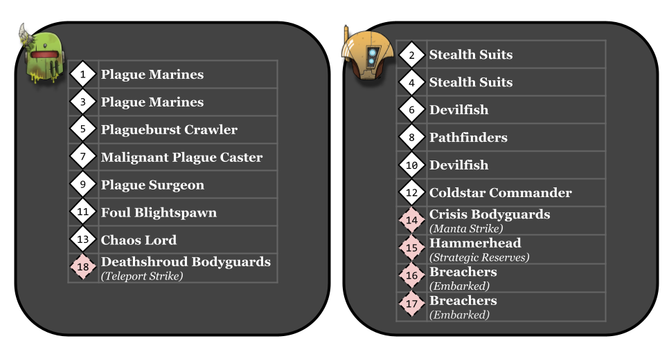 The Grind them Down Secondary is trickier to plan for; it’s plausible that enemy units Plague Marines (3) and Foul Blightspawn (11) could be destroyed this turn, but just 2 units is not an insurmountable challenge for the Death Guard to respond to. Committing too many forces forward at this point as well will leave the Tau’s deployment zone exposed to the Deathshroud when they arrive in either Turn 2 or Turn 3.