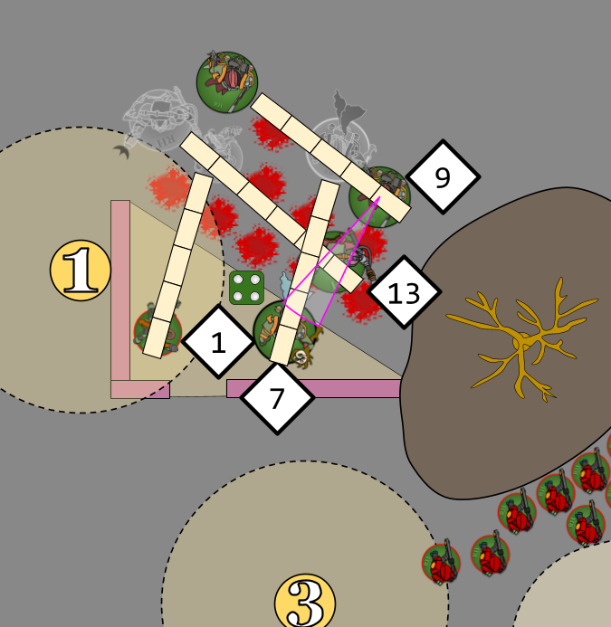 The Tau did manage to reach Objective 2 with a whole unit of Fire Warriors and some Stealth Suits, and managed to get one Fire Warrior onto Objective 3. It's the end of the turn now so this will