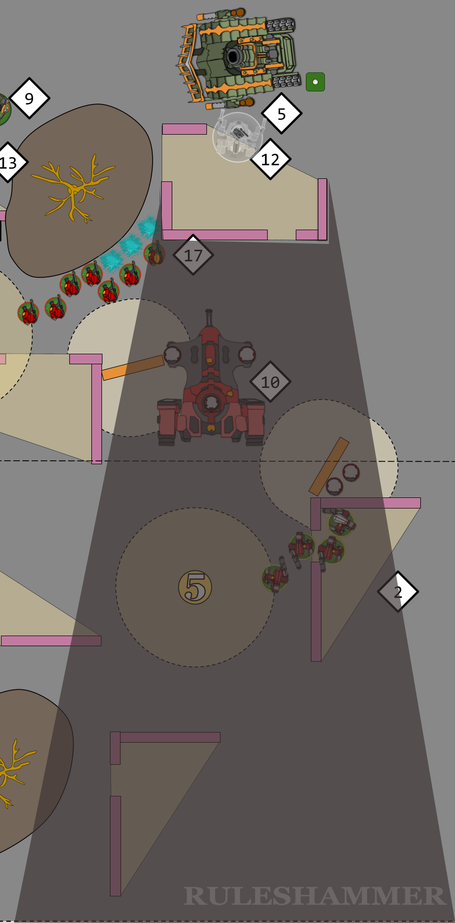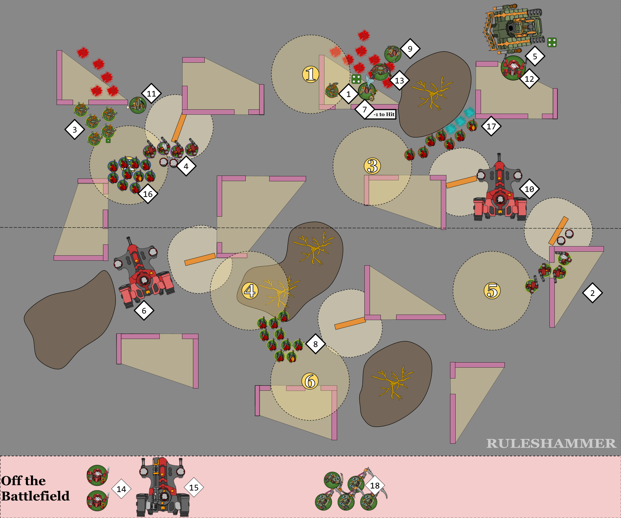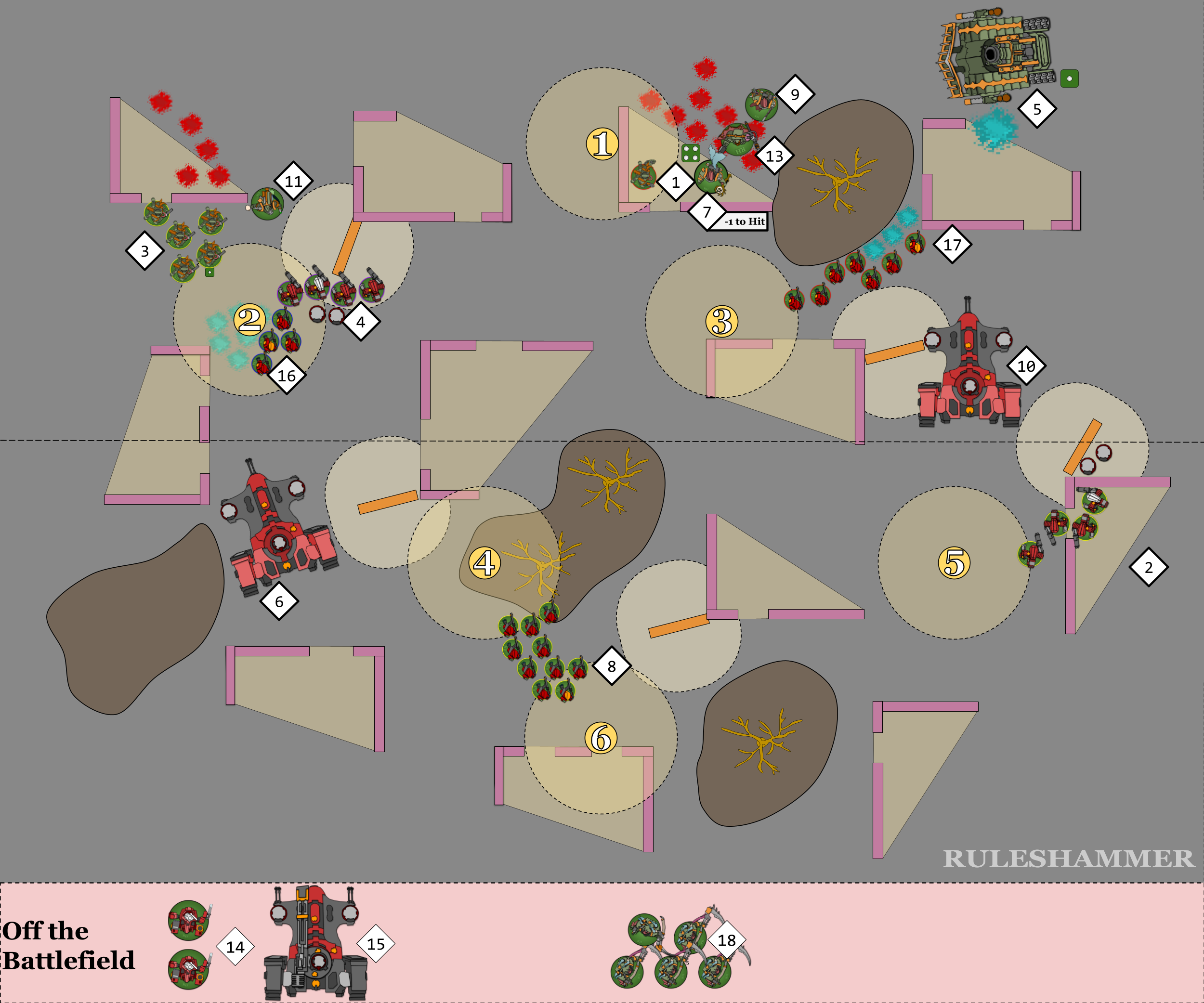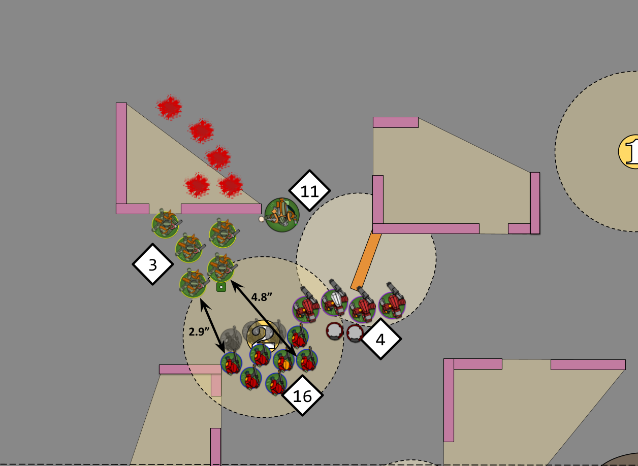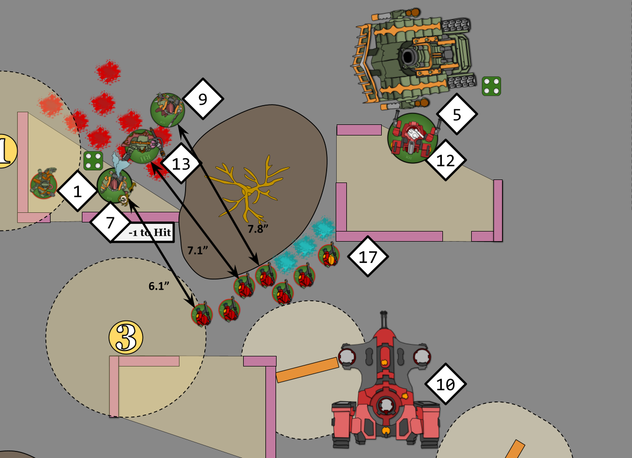 While both sides have models with this ability within range of an objective, then it's simply whichever side has the most models within range. However if all the Fire Warriors die then it becomes either whichever side has any Objective Secured models on the point, which would be the Plague Marines as the Stealth suit unit doesn't have the ability, or if neither side has any Objective Secured then it's back to the side with the most models in range. All of this information makes picking the target for the Foul Blightspawn (11) harder, as they either try to further soften up the Fire Warriors (16) or try to remove the threat of the Stealth Suits (4) and rely on Fighting to secure control. There's the risk that killing further Fire Warriors could make the charge less likely to succeed, they are currently 2.9" away though and the furthest away mode is 4.8", so it's not a massive risk, needing at most a 4" charge.BLAST WEAPONS Some weapons have ‘Blast’ listed in their profile’s abilities. These are referred to as Blast weapons. In addition to the normal rules, the following rules apply to Blast weapons: 1) If a Blast weapon targets a unit that has between 6 and 10 models, it always makes a minimum of 3 attacks. So if, when determining how many attacks are made with that weapon, the dice rolled results in less than 3 attacks being made, make 3 attacks instead. For example, if a Grenade D6 weapon with the Blast rule targets a unit that has 6 or more models, and you roll a 2 to determine how many attacks are made, that roll is counted as being a 3 and that weapon makes three attacks against that unit. 2) When a Blast weapon targets a unit that has 11 or more models, do not roll dice to randomly determine how many attacks are made – instead, make the maximum possible number of attacks. For example, if a Grenade D6 weapon with the Blast rule targets a unit that has 11 or more models, that weapon makes six attacks against that unit.