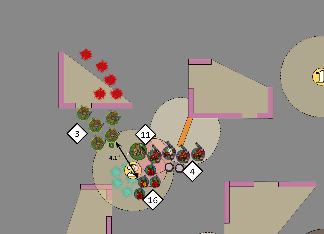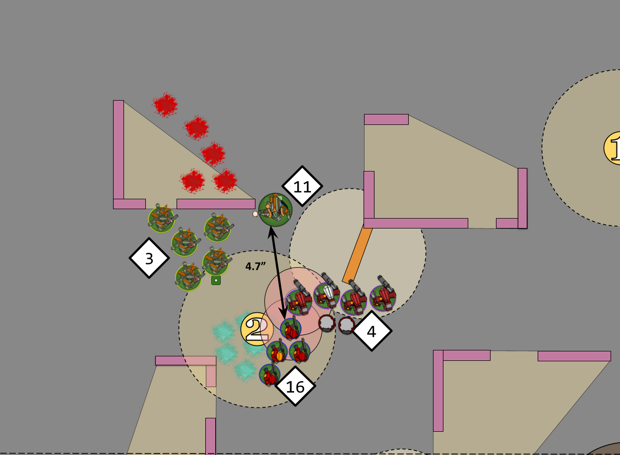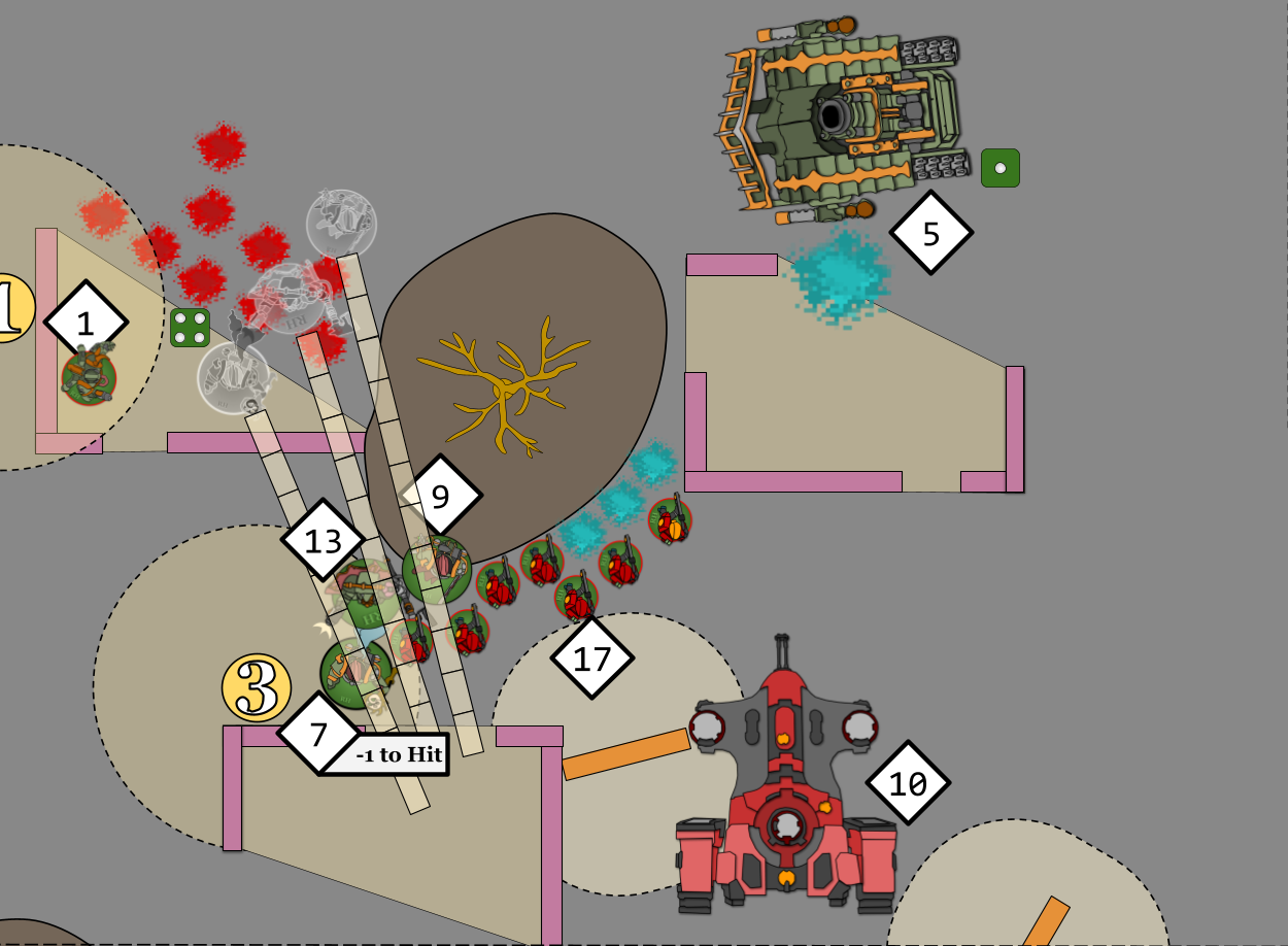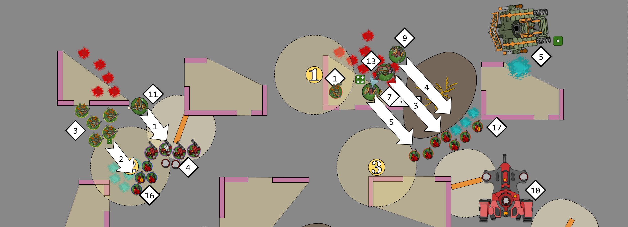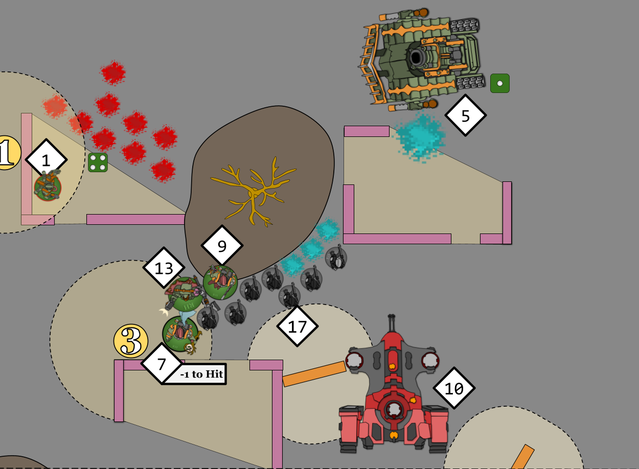 Lastly the three Death Guard Characters (7), (13), and (9) will be attacking the Fire Warriors (17). These fights happen one after the other.