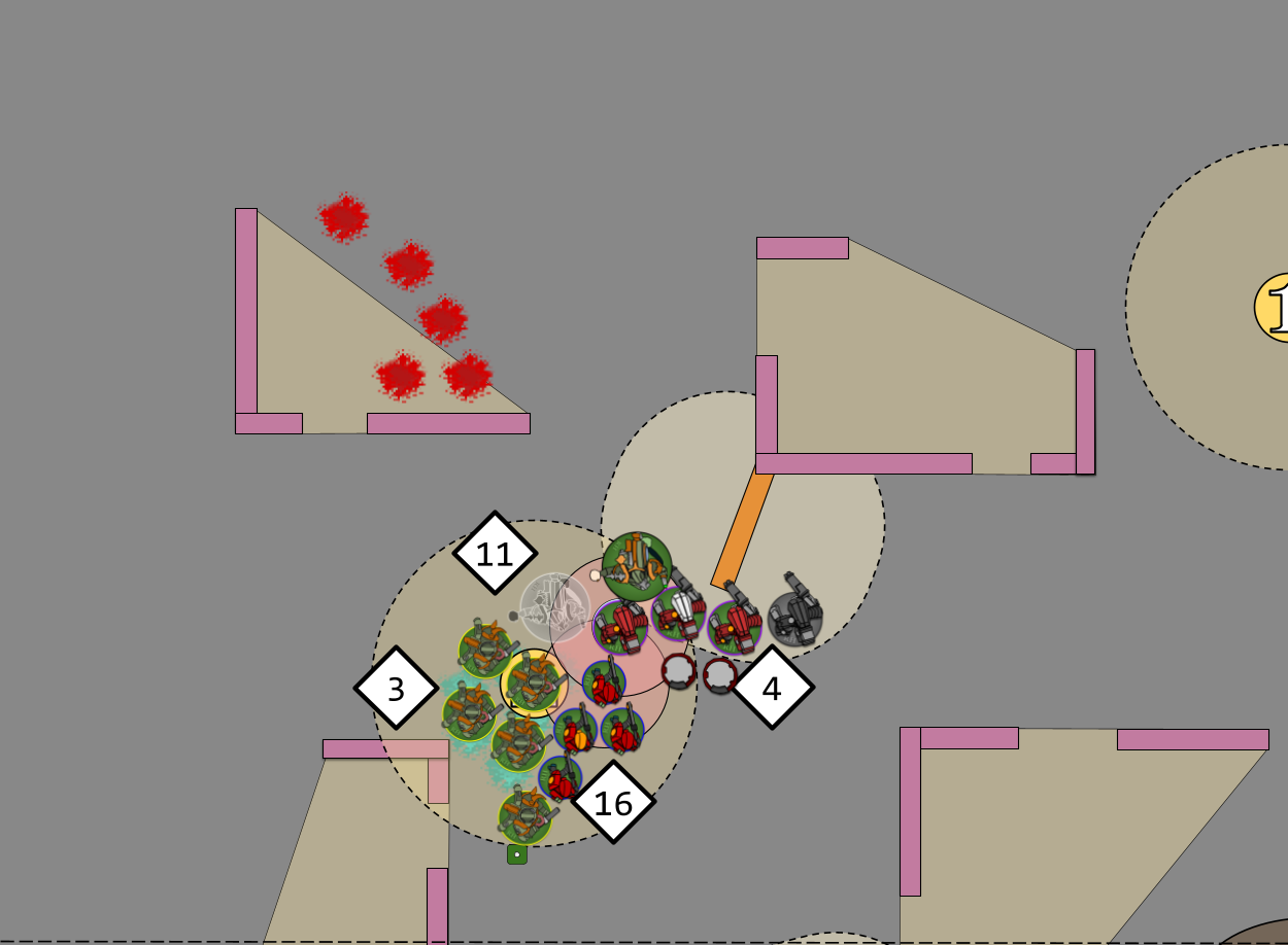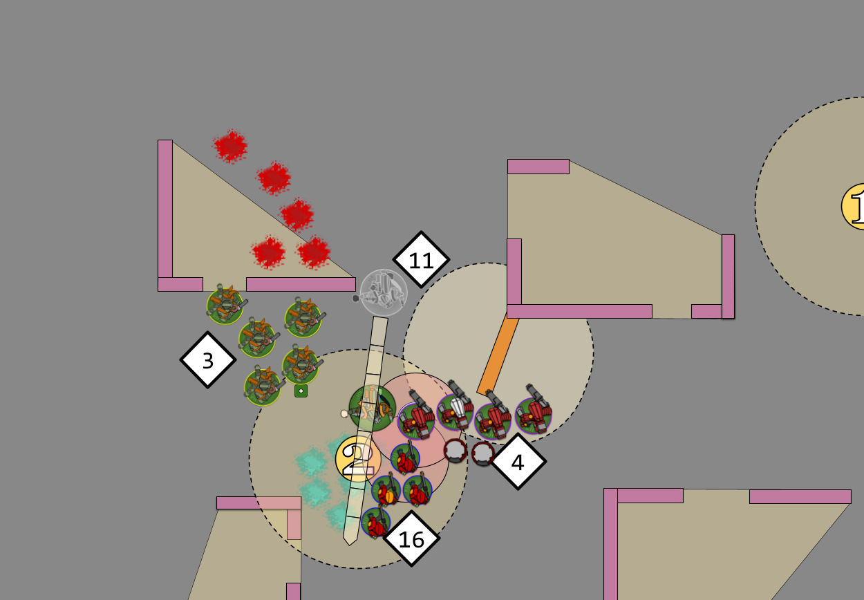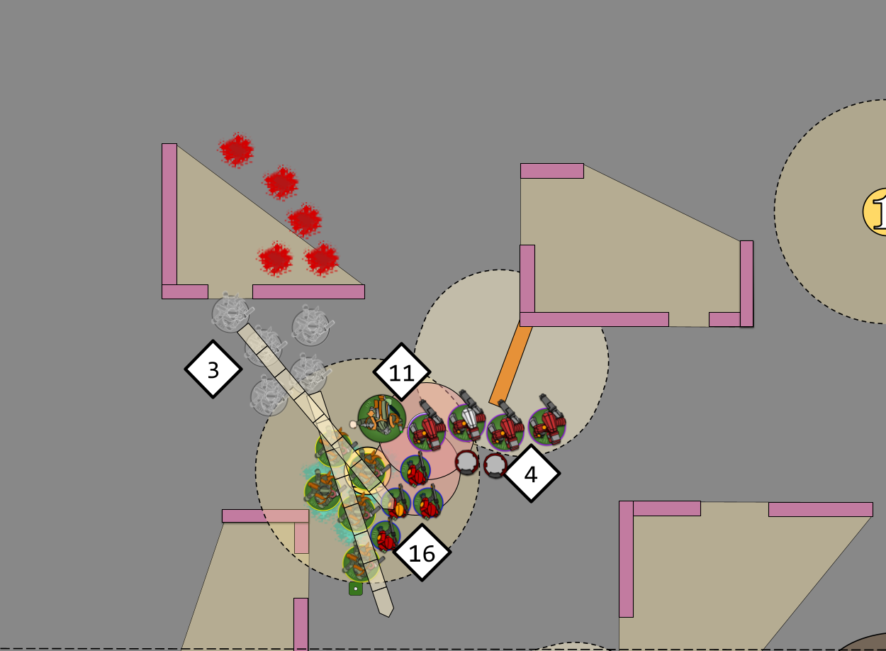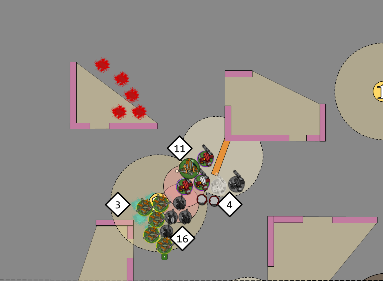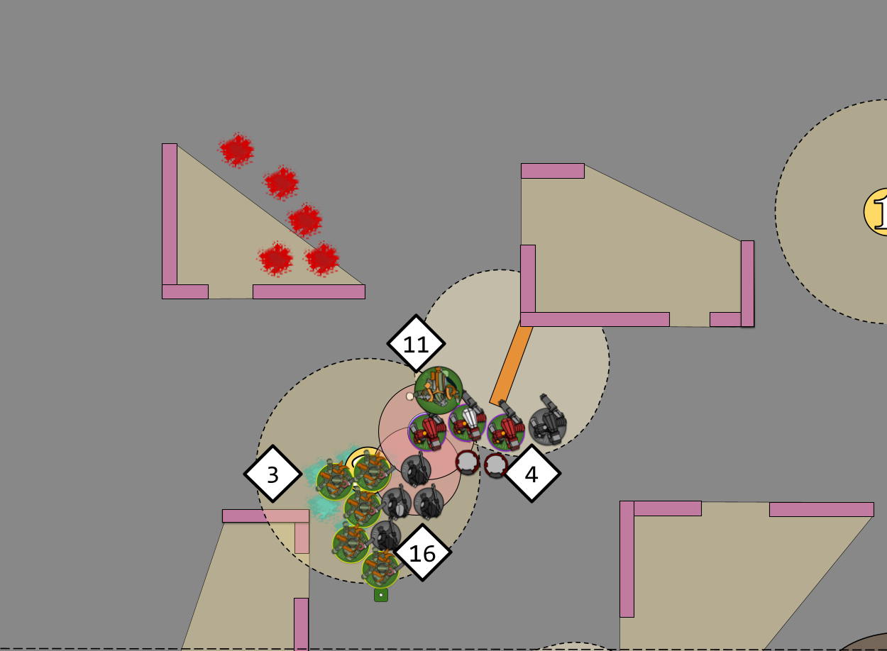 Lastly the three Death Guard Characters (7), (13), and (9) will be attacking the Fire Warriors (17). These fights happen one after the other.