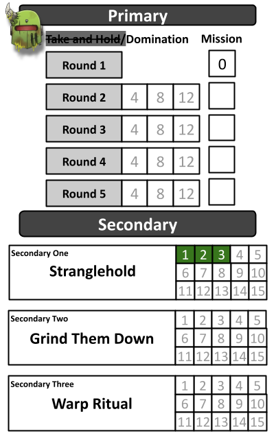 - The Death Guard were trying to take control of Objectives 1, 2, and 3 to score Stranglehold at the end of their turn. However they didn't mention this intent to their opponent when planning their turn, and when they go to score the VP for it now they are reminded that the objective is Hold 3 AND Hold More. Sadly at the end of the turn both sides are tied at 3 objectives each so they fail to score this. If they'd talked about this earlier the mistake might have been noticed earlier, certainly in my opinion informing an opponent about this kind of oversight would be good practice. Regardless, holding more was not an easy task either so it might not have changed much.