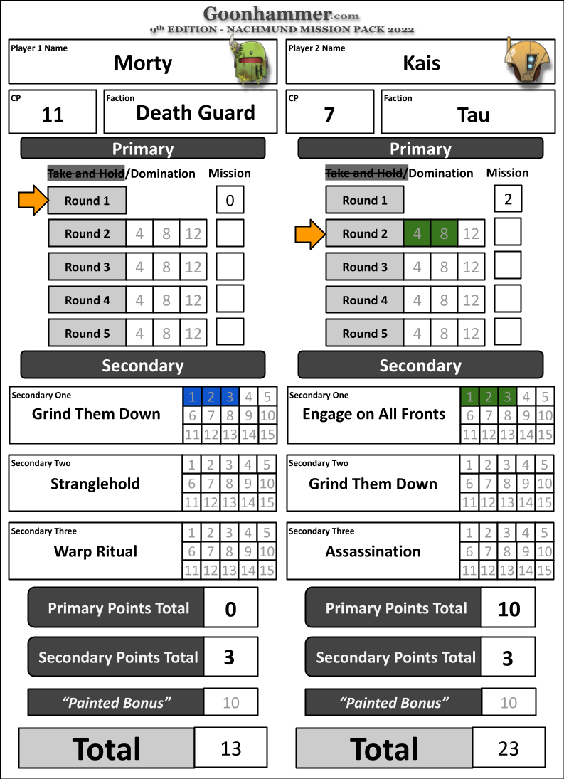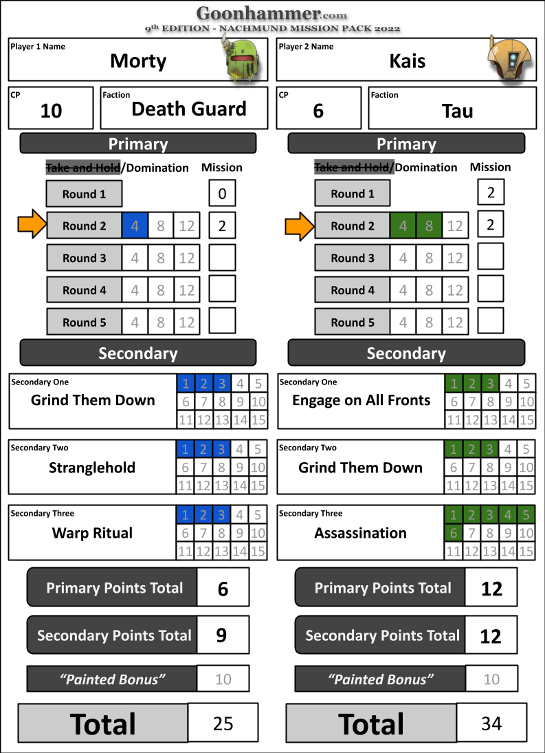 So the Tau player at the start of their 2nd turn would score. 8VP: 4VP for controlling 2 objectives and another 4VP for controlling 3 Objectives. They are however tied with the Death Guard at this point in the game for objective control so they would not score that last 4VP.