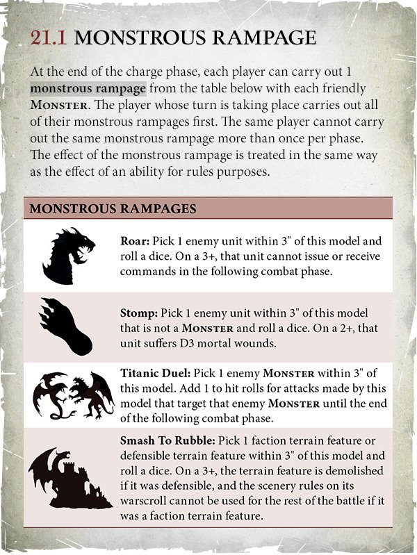 One of the most hyped new parts of Age of Sigmar 3.0 has been the Monstrous Rampages. Monsters previously didn't do a whole lot in AoS. It was a keyword, and some mission types or unit abilities used that keyword but on it's own it didn't do a whole lot other than usually having more health, and a stat block that degraded as they took damage. Now, all