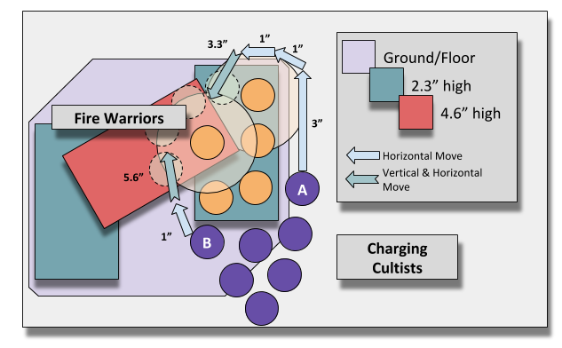 So they can ignore vertical movement in the movement phase, but not in the charge phase. They can however move through enemy models in both. Let's see how that changes our charge distance, if the charging unit were Assault Marines rather than the ground bound Cultists.