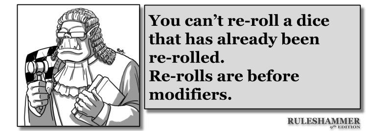 There are many abilities that allow one or more dice to be re-rolled, such as the Command Re-roll Stratagem, available to all armies from the Core Rule book. A dice can only be re-rolled once, so the face value shown after a re-roll is final, after which any modifiers are applied.