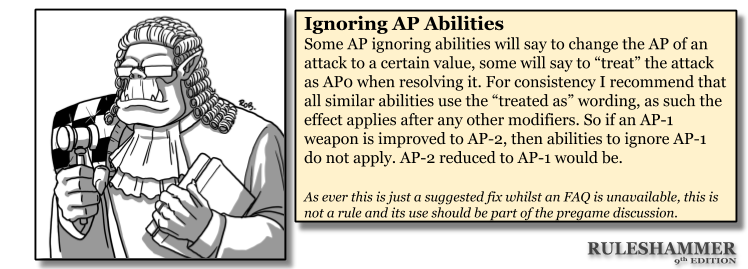 The key thing to notice here is that this wording has you "treat" the attack as having AP 0, it does not set the AP of those attacks to 0. Why does that matter? It matters because of the order in which these abilities are applied. Here's the relevant part from the Modifying Characteristics rules;If a rule instructs you to replace one characteristic with a specified value, change the relevant characteristic to the new value before applying any modifiers that apply from other rules (if any) to the new value. Regardless of the source, the Strength, Toughness, Attacks and Leadership characteristics of a model can never be modified below 1. [Core Rules PDF Pg8]
