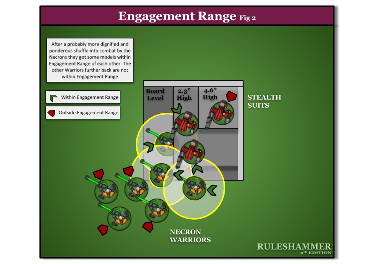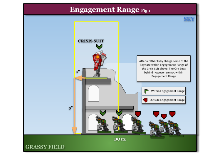 Engagement Range codifies the concept of “within reach of the enemy” into a single term for reuse across the rules, it has a vertical component (5″) allowing for fights across different elevations in ruins, over crates or around barrels. This prevents models from being unreachable when on a 1.1” tall plinth.