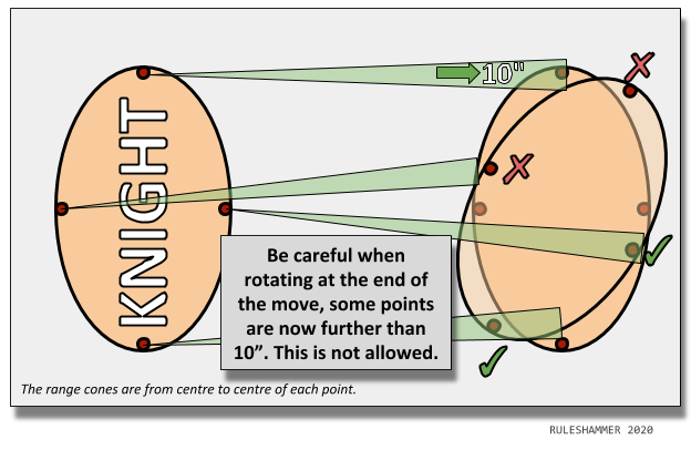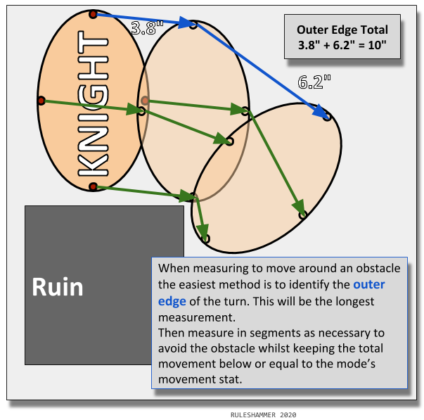 Rotating this way is a really easy mistake to make. Knights and really any model on an oval base really get awkward when moving around obstacles. Here’s how best to measure moving around a small ruin.