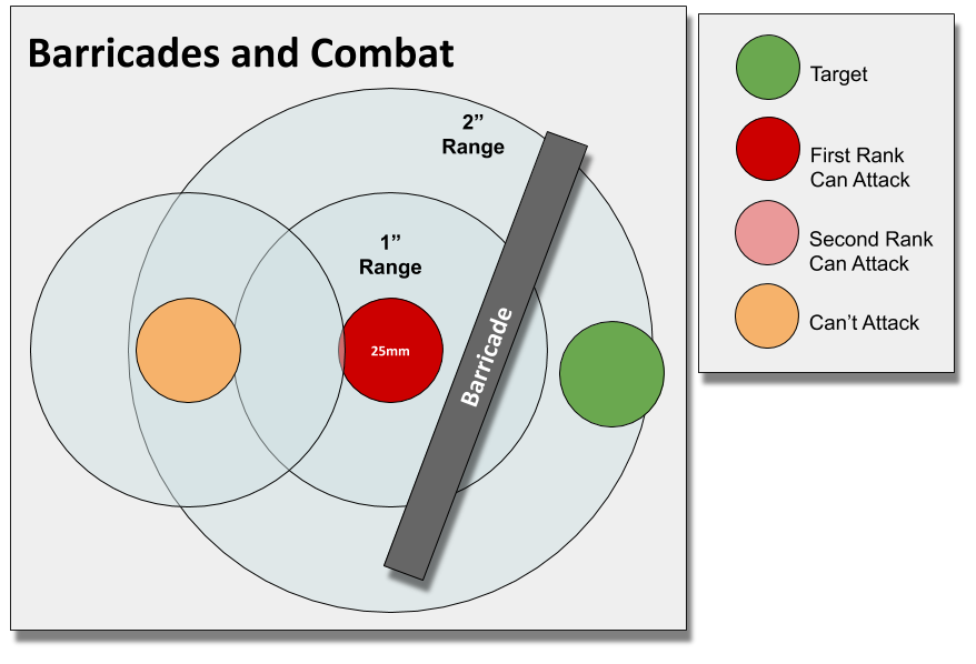 When a unit charges a unit on the opposite side of a barricade, the charge is successful if the charging unit can end the move within 2" of the target unit instead of 1". In the Fight phase, units on opposite ides of a barricade can be chosen to fight with and can make their attacks if there is an enemy unit within 2" instead of 1".