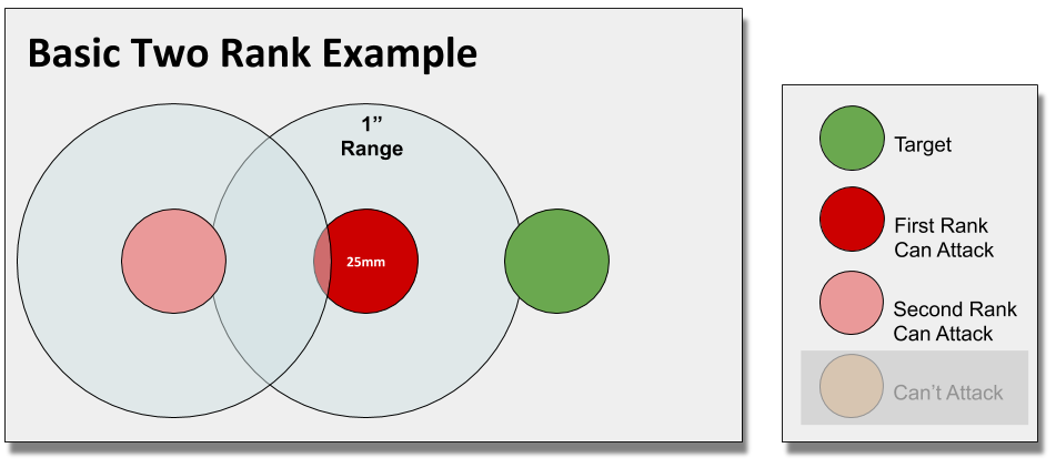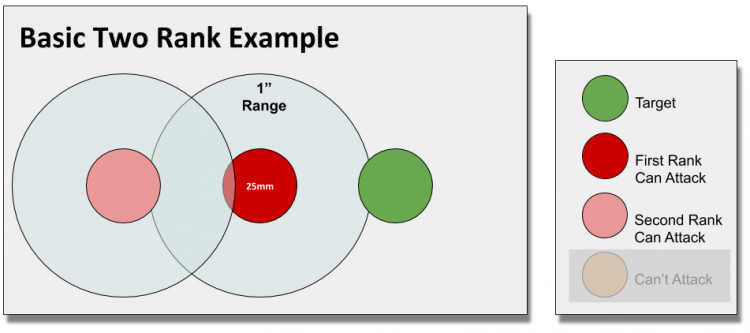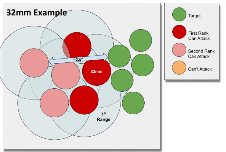 The rules for getting into combat are actually rather forgiving for larger base. Despite being roughly 2.6" away from the target unit, that rear most model would still be eligible to attack. This leads however to the last question this blog will cover;