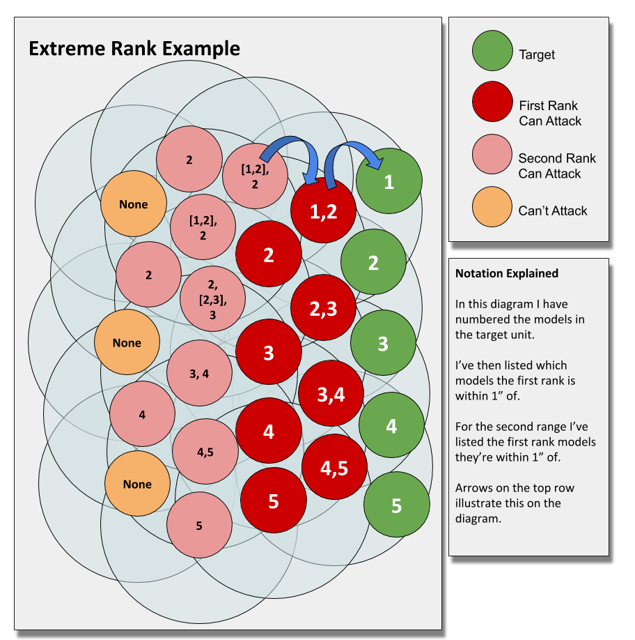 This scenario is far more realistic and would better reflect model placement after the "Pile In" move has been completed. In this example 5 models would be able able to attack. Some would argue that this isn't the intention of the combat range rule, so lets check.