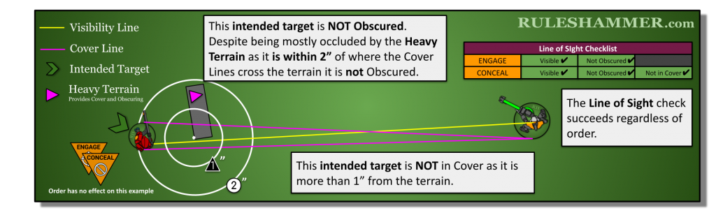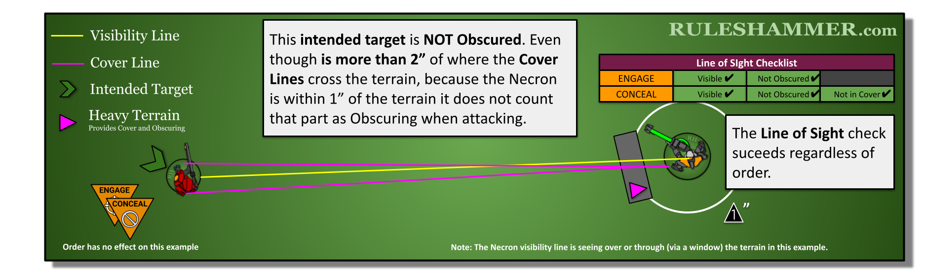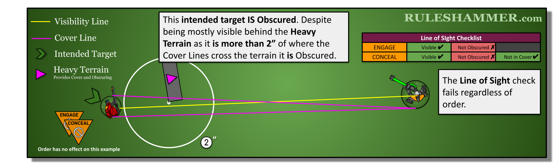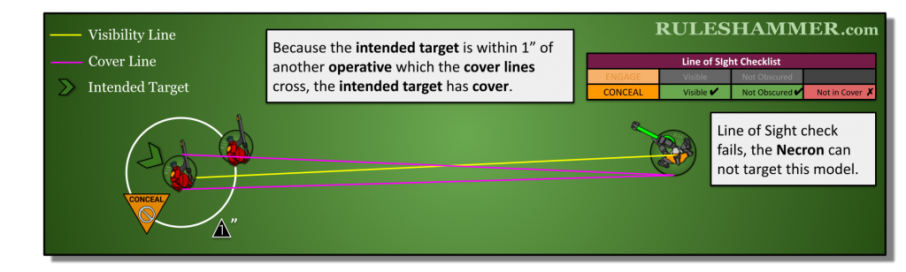 Frustratingly there's some logical negatives here that can make things a bit confusing; the basic concept here is that for a Conceal unit to be considered as within Line of Sight (i.e. a viable target), it can neither be Obscured nor in Cover. Can you be Obscured without being in cover? Yes - an operative that is more than O from a terrain feature that is Obscuring (Heavy terrain has this trait) can count as being Obscured if the firing operative is more than ▲ from the feature - see below for more on this.