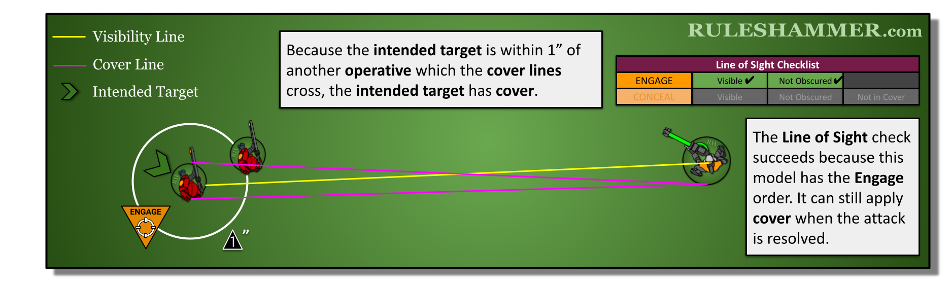 Cover: The Intended target is more than 2" from the active operative AND The intended target is within 1" of a point at which a Cover Line Crosses another operative's base or a terrain features that provides cover.