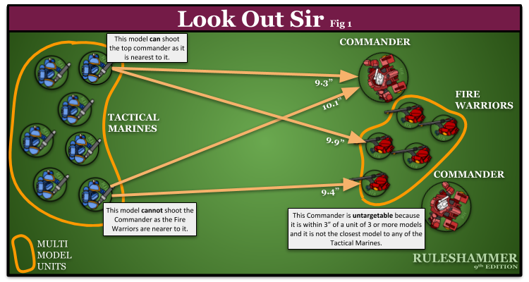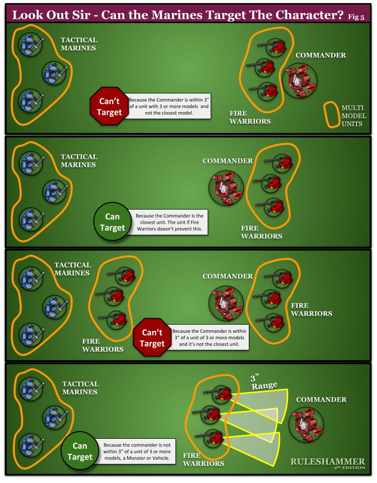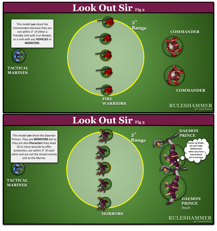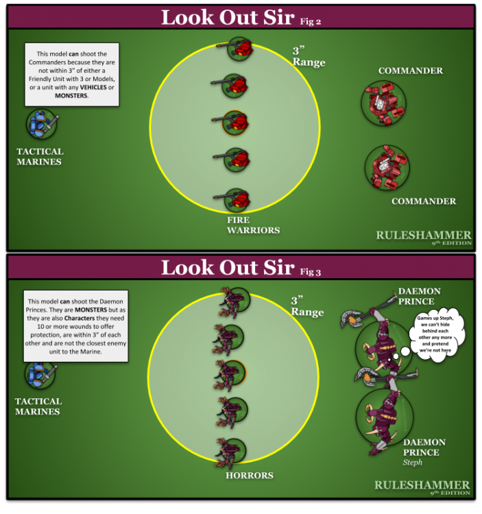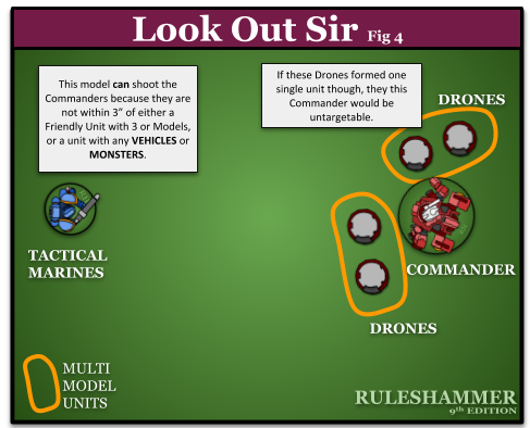 Models cannot target a unit that contains any Character models with a Wounds characteristic of 9 or less with a ranged weapon while that Character unit is within 3" of any of the following: - A friendly unit that contains 1 or more Vehicle or Monster models with a wounds characteristic of 10 or more. - A friendly non-Character unit that contains 1 or more Vehicle or Monster models. - A friendly non-Character unit that contains 3 or more models.