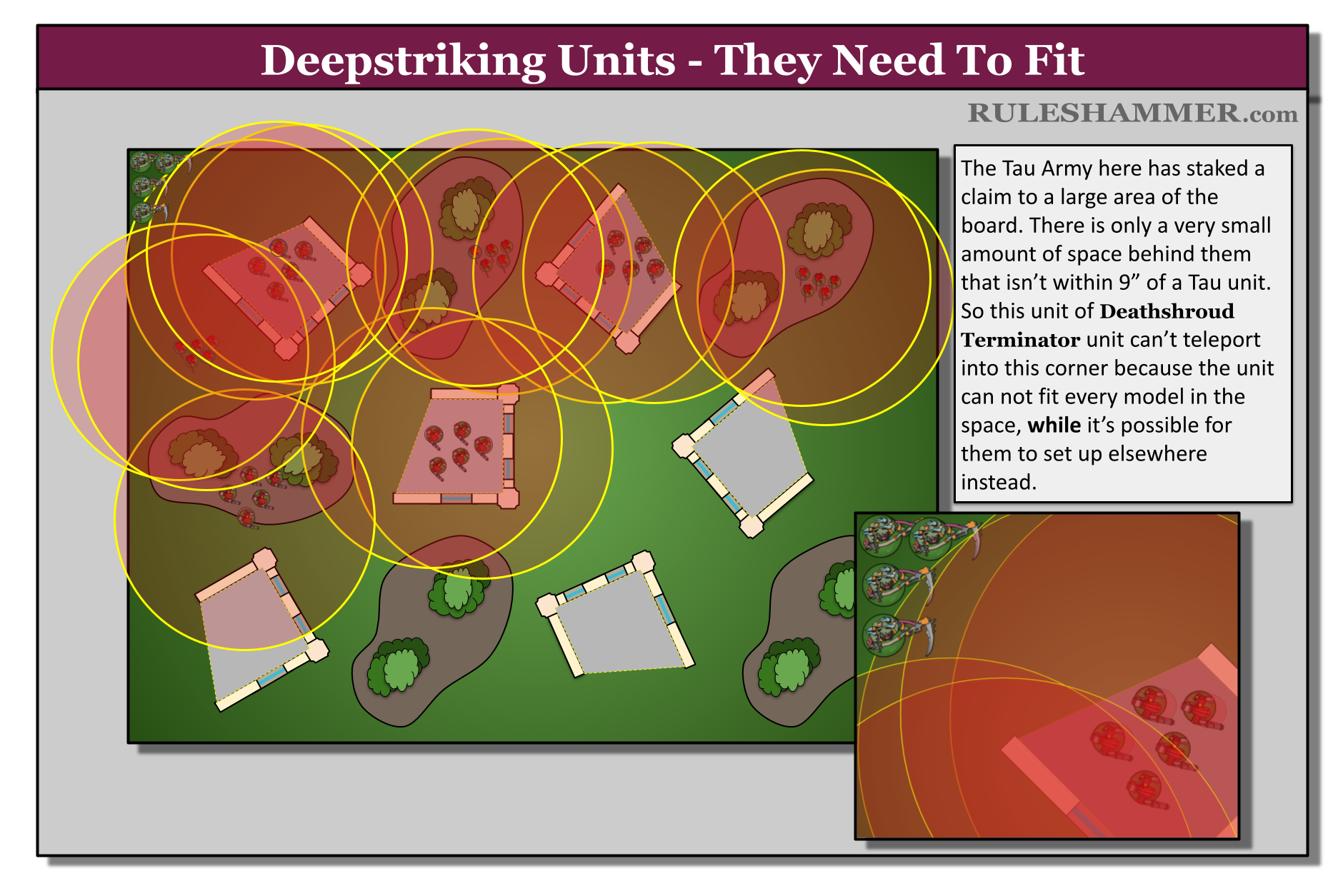 If I try to disembark (whether from a destroyed transport or not) and there is only space for 9 models out of my 10-model unit, is the unit completely unable to disembark (and so dies if the transport had been destroyed, unless I use the Emergency Disembarkation stratagem)? I was recently made aware that in 9th you can no longer bring a deep-striking squad down into a tight space and just have those that can't fit be destroyed, but does this "if one part of the unit can't fit, the entire unit can't be placed there" policy extend to disembarkations too? I can't find a rule stating you can still place a unit if you remove individual models that don't fit. - PomguoSo there’s a few things to unpack here. First of all I want to quickly state that to disembark you don’t need to be able to deploy all models, any you can’t deploy are destroyed. This is made clear by the last few sentences of the Unit Coherency rules (which are, unhelpfully, on a different page form the rules for disembarking):