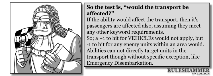 This also makes sure defensive traits such as Alpha Legion’s -1 to hit work - because it would apply to the Transport it also applies to the passengers. They’re not somehow immune to this modifier because they’re inside or on top of a metal bawks.