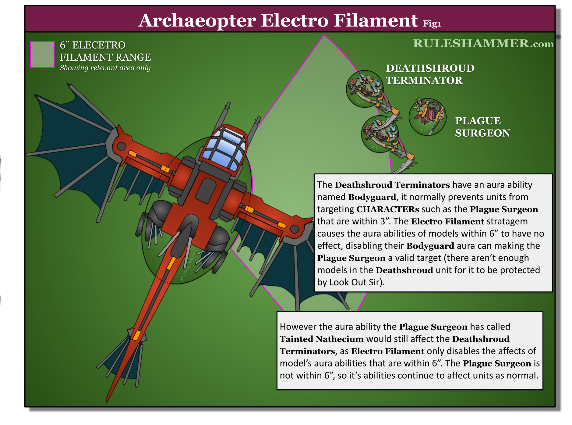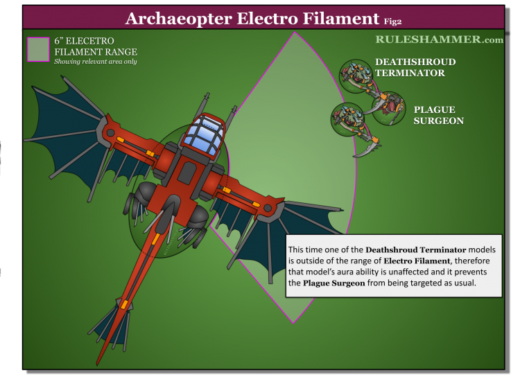 I've seen people argue it so many different ways. One is that all models that are within 6" of the Archaeopter's base that are currently benefitting from an aura outside of the null zone get negated. Another is that models within 6" of a Archaeopter have all of their auras shut down and are unable to provide their aura to units outside of the 6" null zone as their auras now have no effect. Last one I've seen argued is that units within 6" of an Archaeopter can still benefit from aura abilities if the model providing them is outside of the 6" null zone as the aura ability they are benefiting is not their own. - VinceFirst let’s look at the wording of the Stratagem.