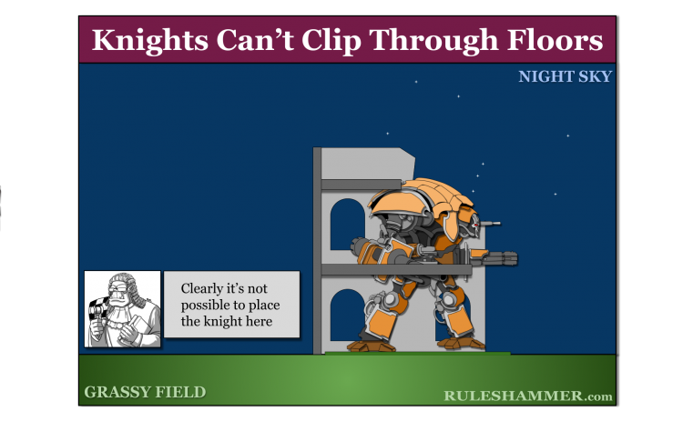 Hints and Tips – Wobbly Models Sometimes you may find that a particular terrain feature makes it hard for you to place a model exactly where you want[1]. If you delicately balance a model in place, it is very likely to fall as soon as someone nudges the table, leaving your painted model damaged or even broken. In cases like this, provided it is still physically possible to place the model in the desired location[2], you may find it helps to leave a model in a safer position, so long as both players agree and know its ‘actual’ location. If, later on, an enemy model is shooting the model, you will have to hold it back in place so they can check visibility[3].Emphasis mine but I think these three parts combined prevent Wobbly Model from supporting a stance where models can clip through walls, floors or anything else.