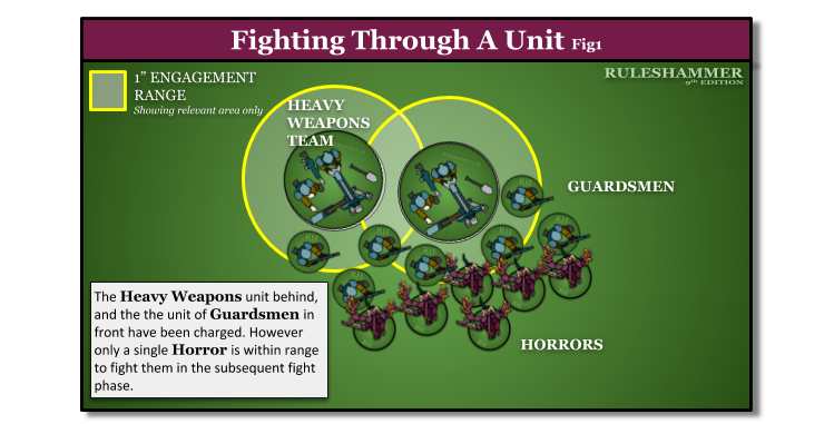 If your unit charged this turn then to be able to fight a unit behind another you need to meet these criteria.