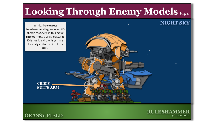 This actually answers part of our question pretty quickly though. Models always ignore other models in their own unit for checking visibility. This doesn’t mean they ignore other units though, friendly or not. You need to resolve this on a case by case basis. I want to pay specific attention though to this part.