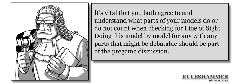Some players also tend to exclude things like antenna, or make a “common sense” ruling when the only visible part of an entire unit is a tiny slither of leg or wing. I would let a dice decide in these cases if both players disagree (if you disagree for more than 30 seconds I’d always suggest using a dice, then get back to having fun having let change decide). However, note that for tournaments the overwhelming majority play "any part of the model" strictly rules as written to avoid any ambiguity, so all parts are assumed as fair game including extras like antenna etc.