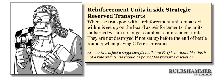 So the transport is deployed in turn 2 using the strategic reserves rules, it has moved as per the reinforcement rules so the unit inside can’t disembark in that turn. If you decide not to disembark the unit in turn 3. What happens to it? It’s a reinforcement unit, so is it dead? Is it on the board or does being in a transport not count? So many questions. Rules as Written I think it might actually count as destroyed if you leave it in there, that is however very silly. So I am once again suggesting a fix.
