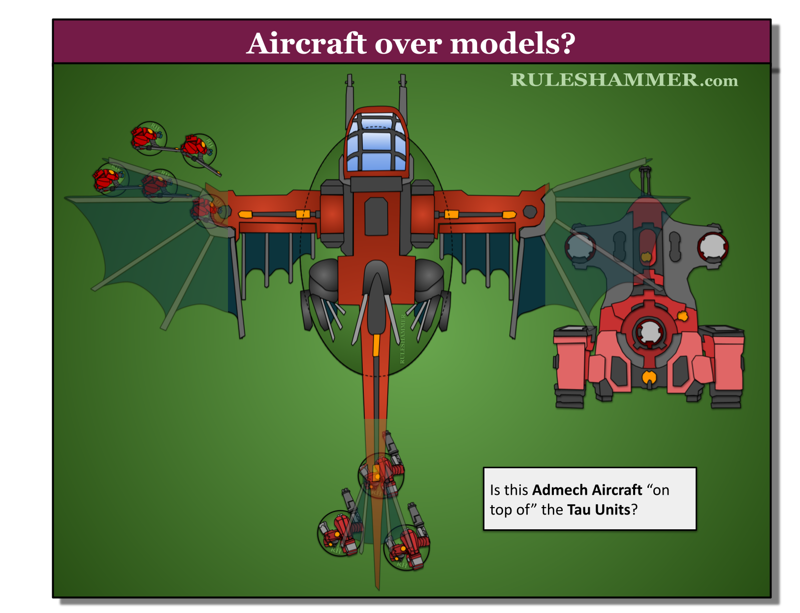 Q: How do I handle intersecting models when a model has a hover base? I was attempting to move into a position to get a wrap on a Starweaver, and my opponent informed me that, since my one DC jump pack marines had part of his base under the wing of his Starweaver, I could not move to the position I wanted. I know the rules section concerning moving through/over models states that you cannot finish a move on top of another model or its base, but what about under a part of the model that isn't the hull and isn't the model's flying stand? Wouldn't that mean that moving around an actual plane would force me to move around the entire model's "footprint" rather than just its base?