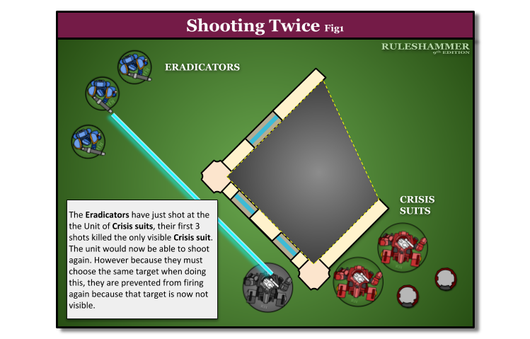 Some rules allow units (or sometimes models or weapons) to shoot again in the Shooting phase, or about (as if it were the Shooting Phase”, Such rules cannot be used on a unit unless it is eligible to shoot at the time when that rule is used. When a unit shoots again, any models in that unit that have already shot with any of the weapons they are equipped with earlier in that phase can shoot with those weapons one additional time.