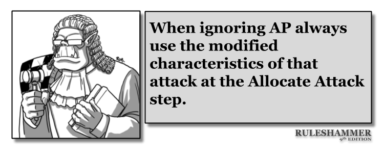Some rules only apply against attacks that have a specific characteristic. For example, ‘Each time an attack with an Armour Penetration characteristic of -1 is allocated to a model in this unit, that attack has an Armour Penetration characteristic of 0 instead.’ Each time you determine if such a rule is triggered, and so applies, always use the modified characteristics of that attack at the Allocate Attack step of the attack sequence. In the example above, that means that if an attack which originally has an Armour Penetration characteristic of 0, but then is modified by another rule before the Allocate Attack step to be -1, then at the Allocate Attack step it would then trigger the ability and be changed back to 0 instead.