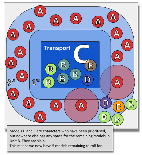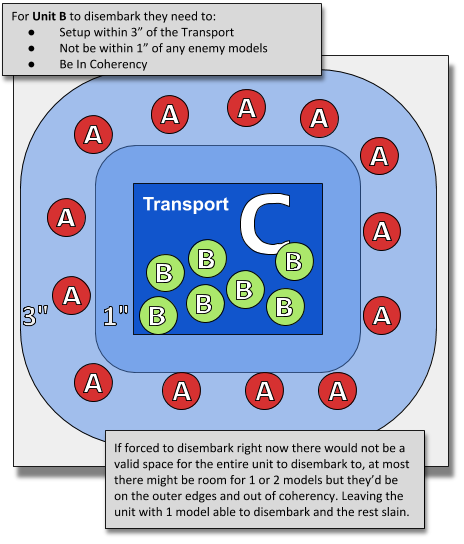 If a transport is destroyed, any units embarked within it immediately disembark (see below) before the transport model is removed, but you must then roll one dice for each model you just set up on the battlefield. For each roll of 1, a model that disembarked (your choice) is slain. Units cannot declare a charge during the same turn that they disembarked from a destroyed transport. [[Core Rules Pg. 9 - Updated in Core Rules FAQ Pg. 2]In a rule set that up til this point has been entirely about actions taken by Units and things happening one at a time this can so easily be done wrong.