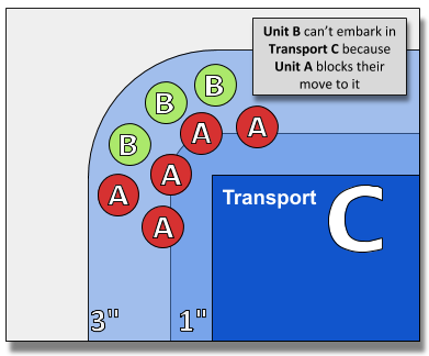 Q: Can a unit that is within 1" of the enemy and entirely within 3" of a friendly Transport embark into that transport without having to move? For example, because they cannot Fly and would have to move through enemy models? A: No. [Core Rules FAQ Pg11]So if a model is pinned in combat or there are models between the and the Transport you can’t embark. If you have a way of ignoring them though, such as FLY, then you still do so. This serves mostly to prevent a transport from magically scooping up a unit that has been tied up in combat.