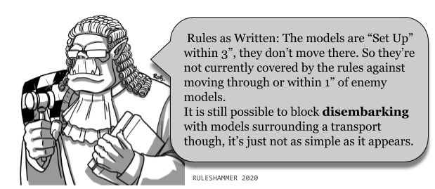 Generally embarking is the least confusing part of the transport rules, it has a clearly defined rule and there’s not too much ambiguity to FAQ. What is covered by the FAQs is mostly reinforcing concepts from other rules that apply here. Embark: If all models in a unit end their move within 3" of a friendly transport in the Movement phase, they can embark within it. Remove the unit from the battlefield and place it to one side – it is now embarked inside the transport. Embarked units cannot normally do anything or be affected in any way whilst they are embarked. Unless specifically stated, abilities that affect other units within a certain range have no effect whilst the unit that has the ability is embarked. [Updated in Core Rules FAQ Pg2]So far so good, get to within 3” and hop inside. Simple enough. However the key thing to not here is that there’s some subtlety in these rules. You need to be able to move to the transport. This is clarified in the FAQ below.