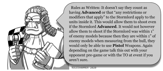 Stormlord - Imperial Guard Extended Firing Deck: Up to 20 models being transported by a Stormlord can shoot in their Shooting phase, measuring and drawing line of sight from any point on the vehicle. Units that shoot in this manner count as having moved if they or the Stormlord moved in the preceding Movement phase.So... this is... yeah...