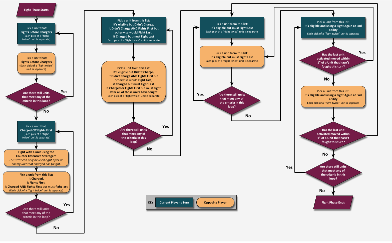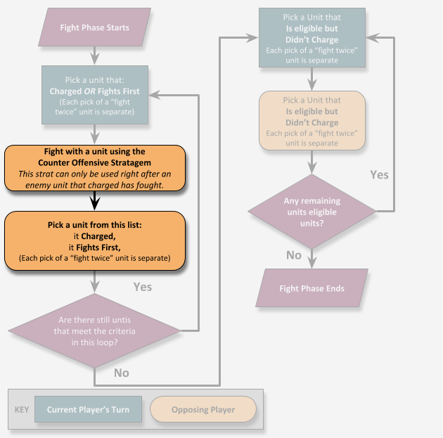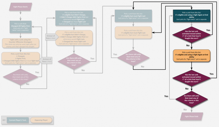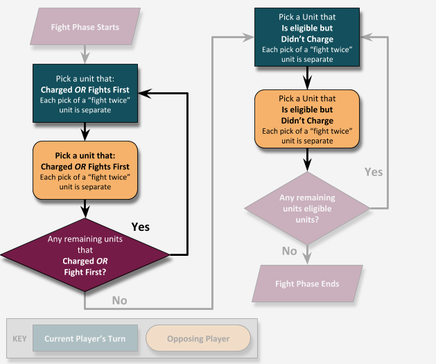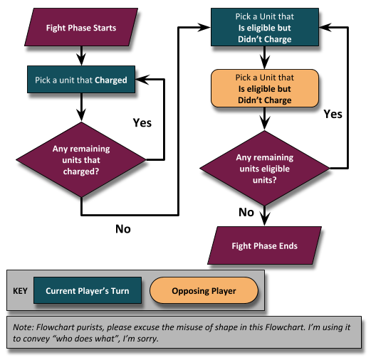 This chart doesn’t cover what makes a unit eligible to fight, just in what order eligible units should. That will be true for all the flowcharts coming up as well! The basic premise is that the units you can choose from in the Fight Phase are split into two loops (for now). “Units that Charged” and “Units that Didn’t”. This article is not about these fight phases though...