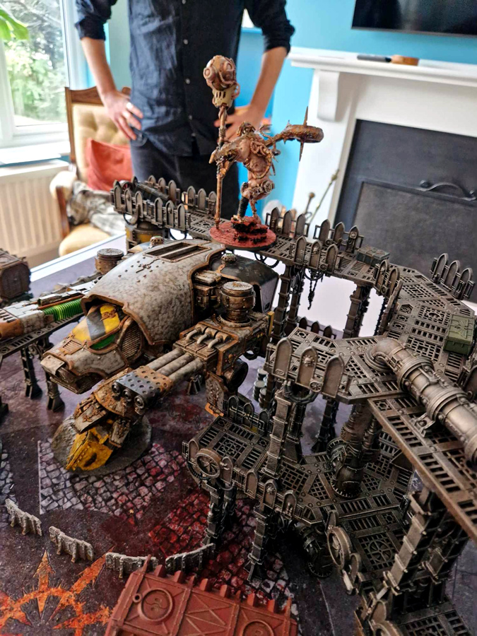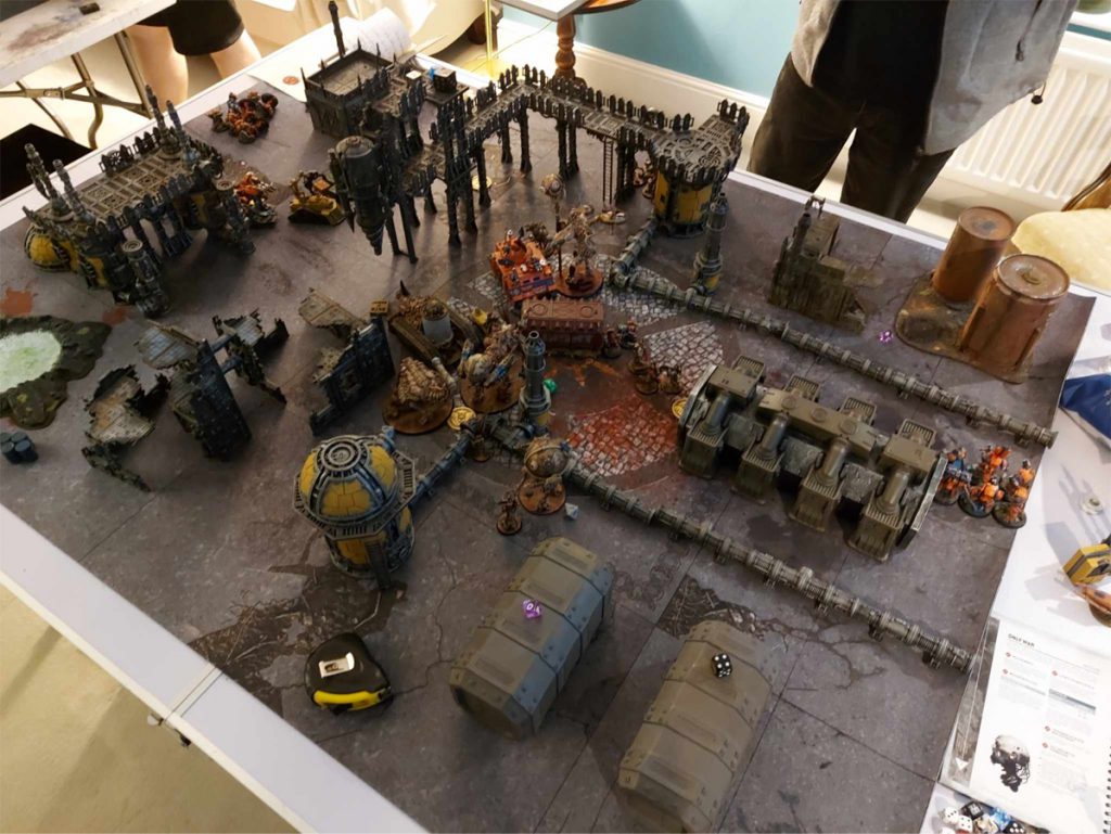 I wake up, un-filth myself in the shower, and start laying out terrain for the grand finale. Gir has kindly brought his titan-shaped resin child down from Bristol for us to use as Ma’Ta’s pet project, and I build the terrain around it, laying out pipes and gantries all converging on it, to try and give a sense of this thing drinking vast reserves of power as it prepares to awake. People stop by and ask if they can help, or if they can bring me any breakfast, but I’m in full terrain goblin mode. I simply will not be distracted until I’m sure I’ve prepped everything, and it’s quicker for me to just do stuff than spend ages explaining what’s needed. The layout is not necessarily balanced, and is somewhat a case of form over function. It’s probably more of a disadvantage to my own side, so I figure it’s a forgivable sin.