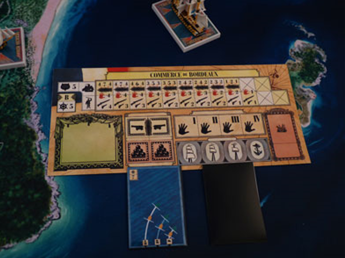 In the basic game, you only plan one maneuver, which all players resolve simultaneously. Unlike in space, you do have to take wind direction into account. Sailing directly into the wind will make you move backwards in some cases. Once you’ve moved, you can check if you’re in range and either shoot cannons or resolve musketry fire. The range ruler is divided into different colors, and you draw tokens according to this color. The closer you get, the higher the damage is. Your ship log shows the number you have to beat with those tokens to fill up a slot, and you use the next free slot to see how effective you are, probably less. You take off a reload marker when you’ve made a shot, and have to reload in the next turn before you can shoot again. That’s it! That's the basic game and it’s easy enough to get a feel for the rules and learn how to maneuver a bit, but it’ll be boring after a while.