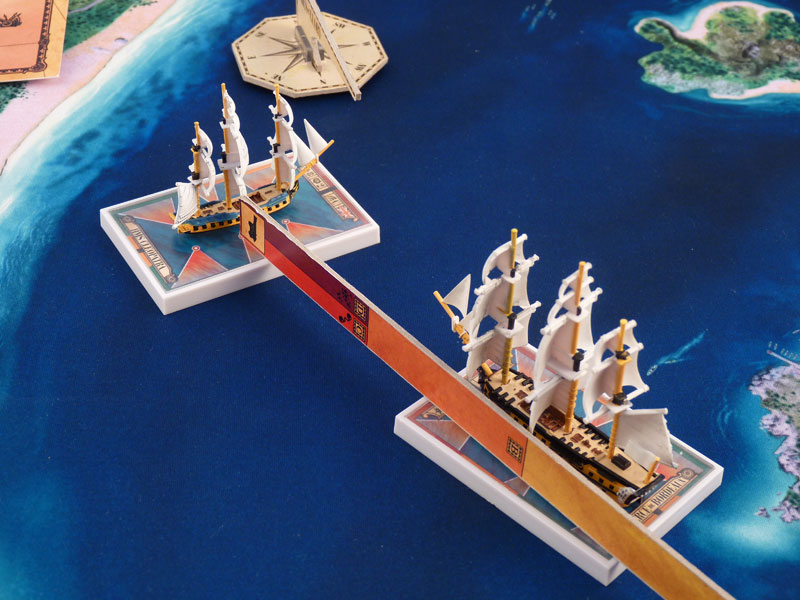 The advanced rules are a mixed bag. They add a whole lot. Different damage types, sail settings, crew and orders, being on fire, putting out fires… This is all very realistic, and while the ship logs are handy in tracking everything, you’ll find that you’re increasingly busy with putting tiny tokens on the right box instead of blowing up your opponent. This leads me to the main drawback of the system; it’s fidgety. Well thought-out, intense, but not the most friendly in that regard. If you’re using every rule keeping track of more than two ships becomes a chore (or a spell on the fainting couch). The object isn’t to game with an entire armada per side of course. A couple of ships maneuvering, possibly part of a bigger battle, blockade or picket line.