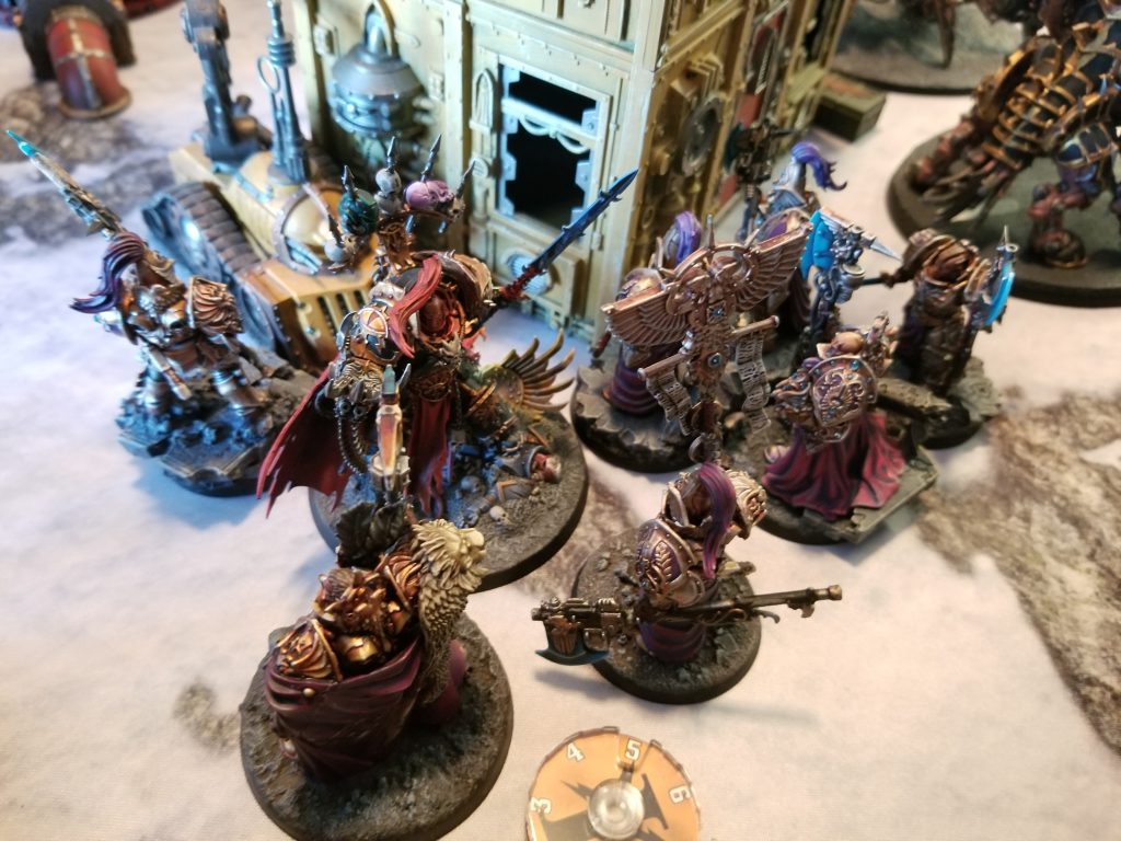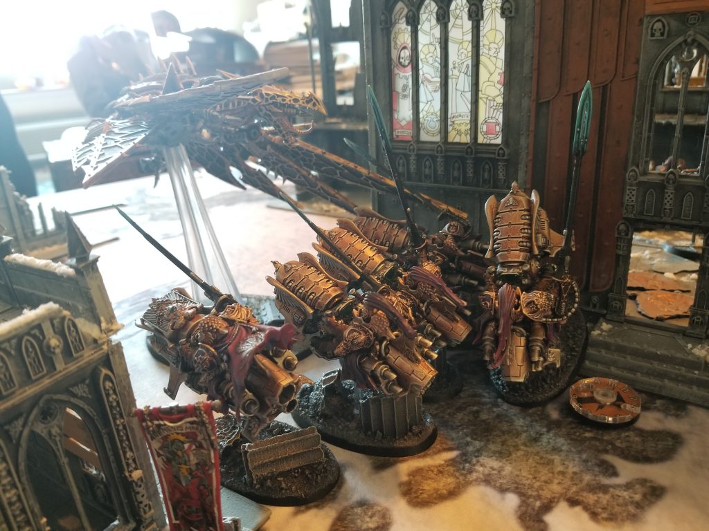 Crab-Stuffed Mushrooms ("CSM") gets the first turn by virtue of deploying first. Custodes are nasty, but they aren't known for their long-ranged firepower, particularly when they don't have any of their Forge World vehicles with them. So I know that any first turn will be filled with walking forward, getting into range of my guns and allowing me to counterattack. I decline to Seize. Before he can act, I use my Dark Apostle to lay Benediction of Darkness on my Heldrake. I need it to survive reaching the Custodes bikers so it can tie them up. This was probably a waste.