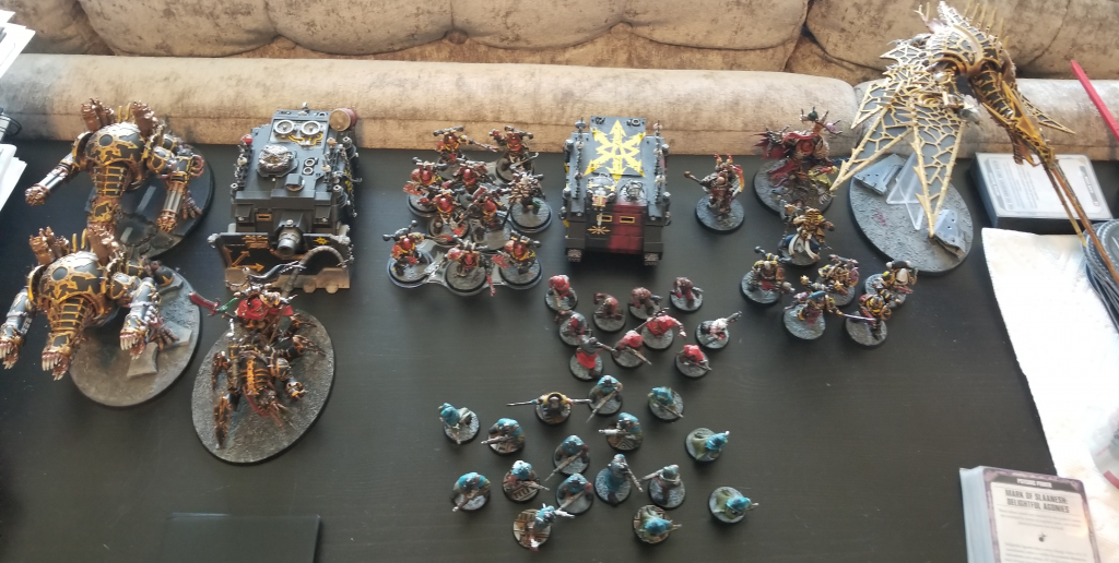One of the key abilities in play this game was the Council of Traitors Stratagem for the Black Legion, from Vigilus Ablaze. For 1 CP, I can give a Sorcerer and a Dark Apostle in the army each a Warlord Trait. I gave the Sorcerer the Warp Lord trait to help his casts, and the Dark Apostle the Trusted War-Leader trait, allowing me to get back CP every time I use a Stratagem on a D6 roll of 5+. Over the course of this game, it was worth an extra 3 CP for me, paying for itself and then some.