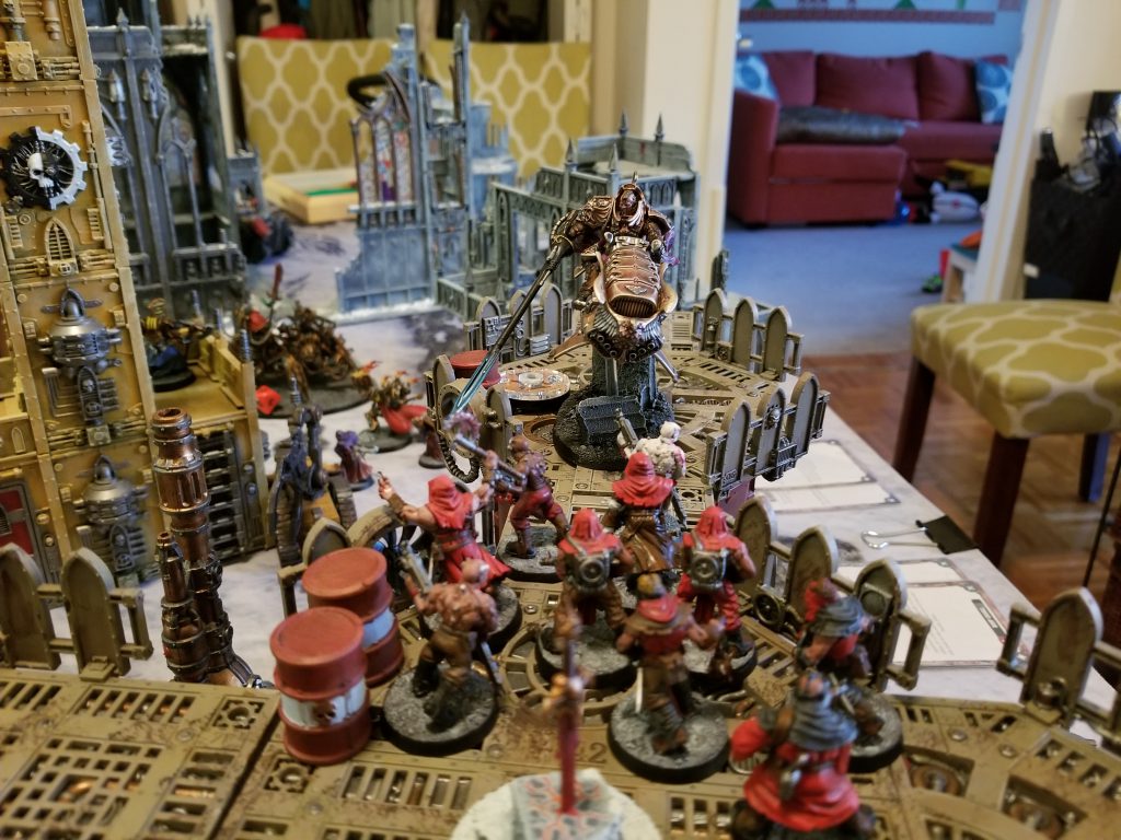 Crab-Stuffed Mushrooms is a fellow goon and also a local in the area who I'd never played against. He has some beautiful Custodes models, and while he doesn't play very often, he was eager to get back into it. His army is led by Trajann, on whom he played Victor of the Blood Games, with an assist from a Shield-Captain on Bike.