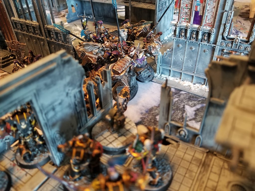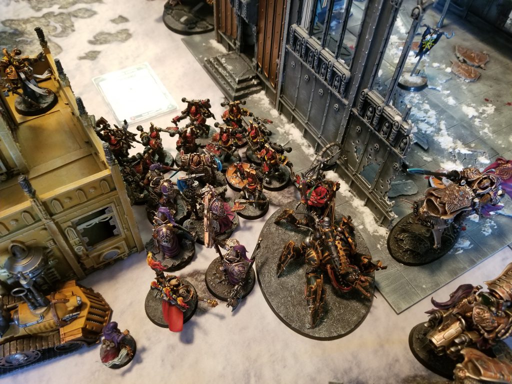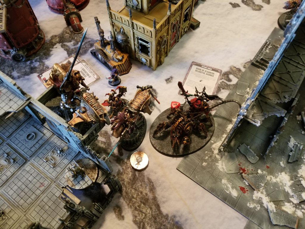 At this point, the Custodes needed a lot of help to pull out a win, but CSM had options. One thing he absolutely had to do was make sure his final Custodes bike ended up in my Deployment zone, so he could score the extra point from Linebreaker. He also needed to capture Objective IV, which meant taking out a squad of Cultists. Fortunately, he was able to kill 4 in the shooting phase and another 4 in the Fight phase, causing the remaining two to flee, scoring him an additional VP.