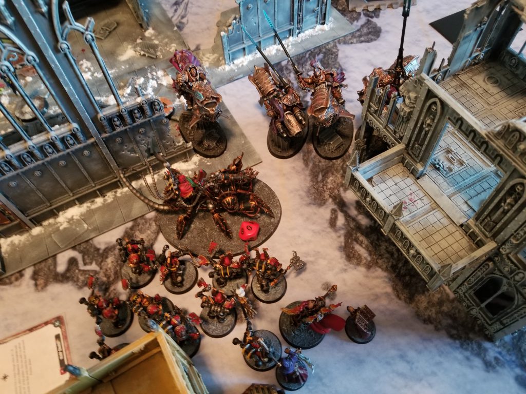The Heldrake is here to tie up a unit on Turn 1. If he can trap the Bikers, then he can prevent them from charging something else for a turn, and if he also manages to kill one with his claws in melee, all the merrier. The Heldrake charges and, using the Daemonforge Stratagem, manages to put 3 Wounds on a Bike, but can't close the deal. On the plus side, the Bikes only do 2 damage back to it, leaving it alive to stall them for a turn.