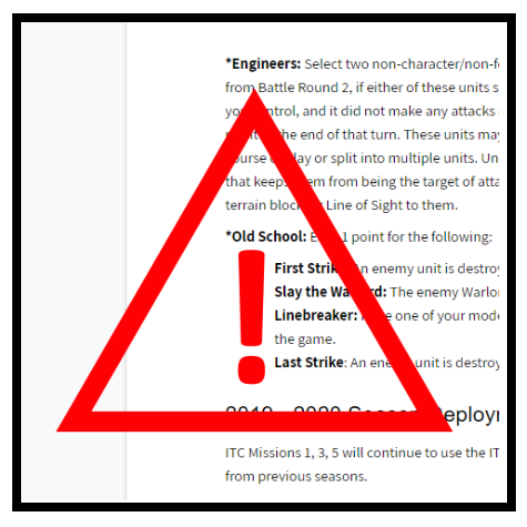 The list is pretty sizeable, but as you'll see once we start discussing how to pick them, you're likely to find that in any given game only a subset of the objectives are possible (especially once you account for the stacking rules) and an even smaller number are "good". There are lots of different objectives that reward you for killing a variety things, but tournament lists tend to be quite focused, so it's unlikely you'll always see the random mix of stuff needed to easily fill up on those. Most armies can theoretically achieve a lot of the positional ones, but outside of Recon it takes quite a specific list or plan to avoid making it easy for your opponent to thwart you. Finally, Old School sits at the bottom of the list playing enchanting harp music about how soothing and familiar it is, plotting to lure people onto the rocks of failure then devour their corpses and steal their ITC points.